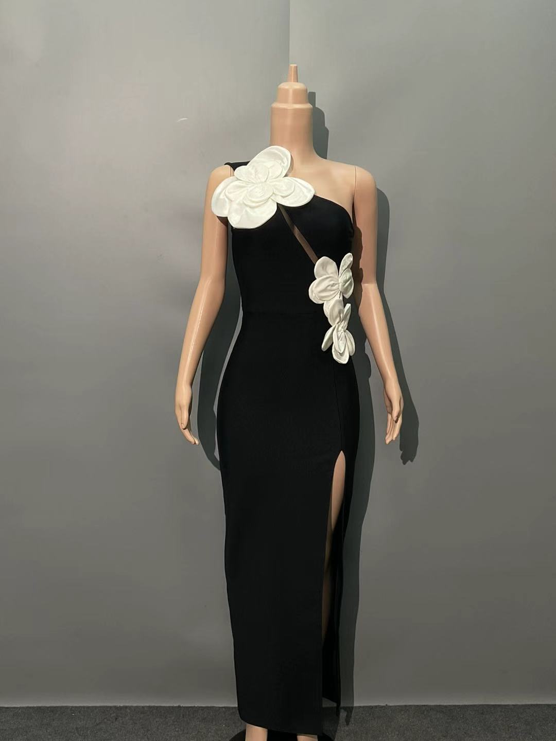 New Slant Shoulder Three-Dimensional Flower Evening Dress Sexy Elegant Party Party Tender Women's Dress