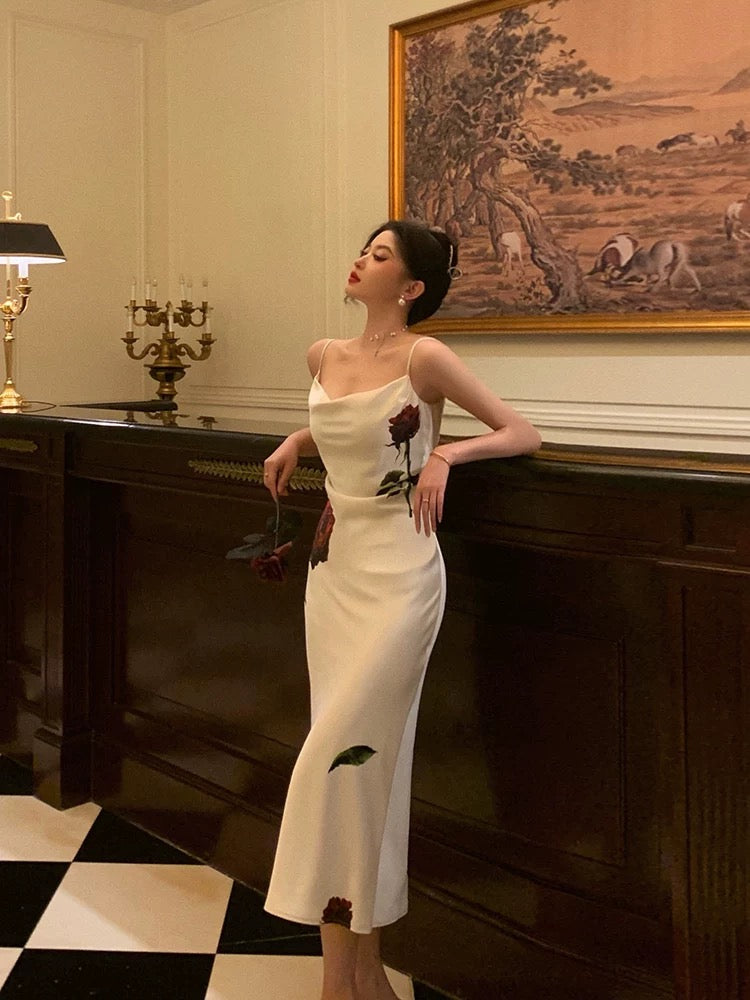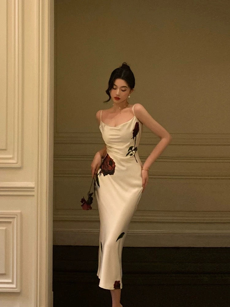 Mermaid Spaghetti Straps White Floral Date Night Dress Prom Dresses Birthday Outfit SD725