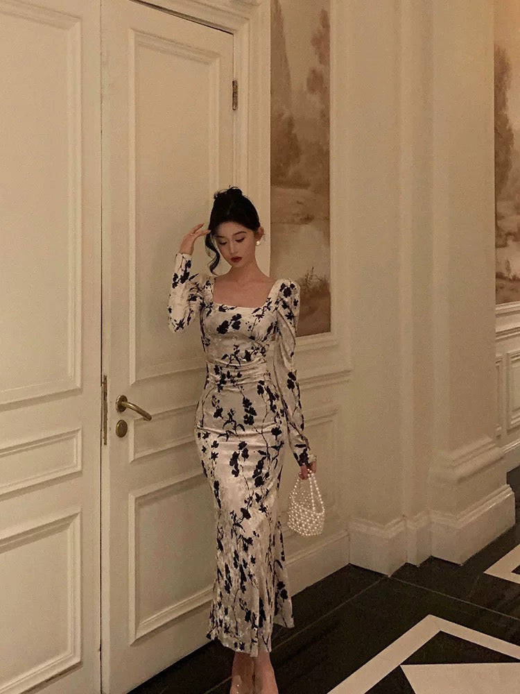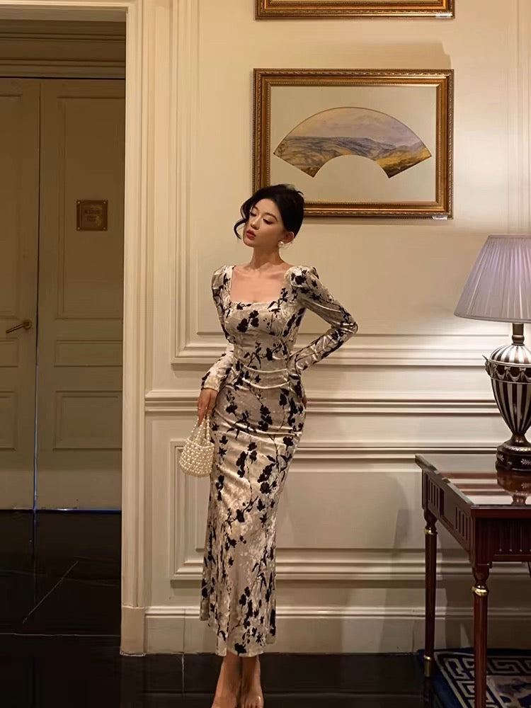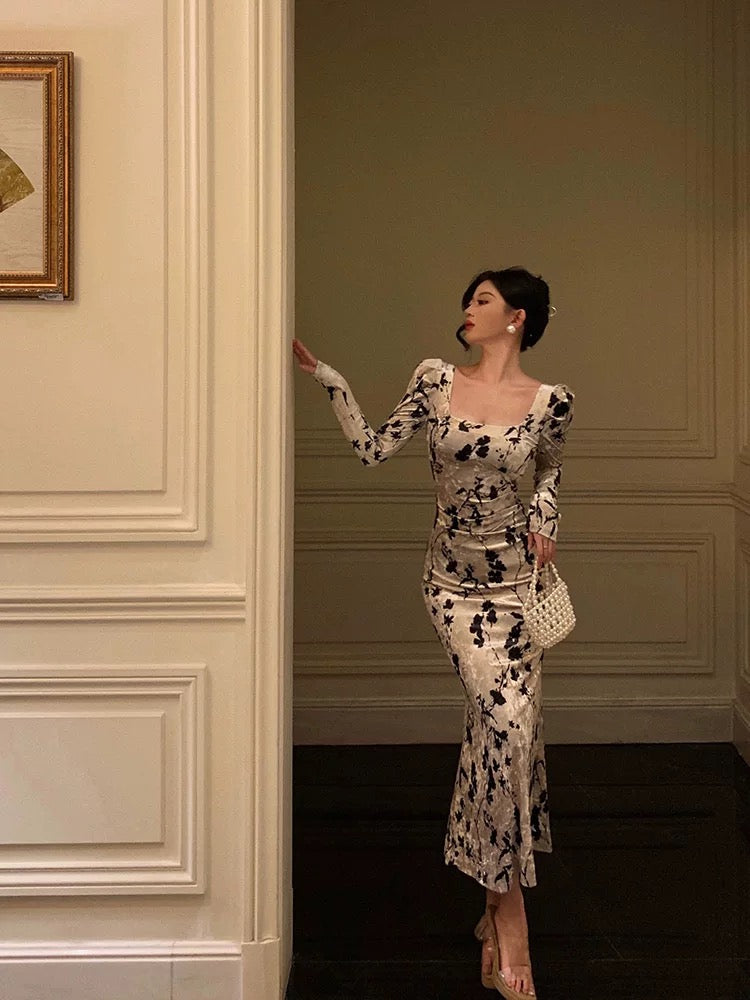 Sheath Black Floral Velvet Long Sleeves Prom Dresses Birthday Outfits SD310