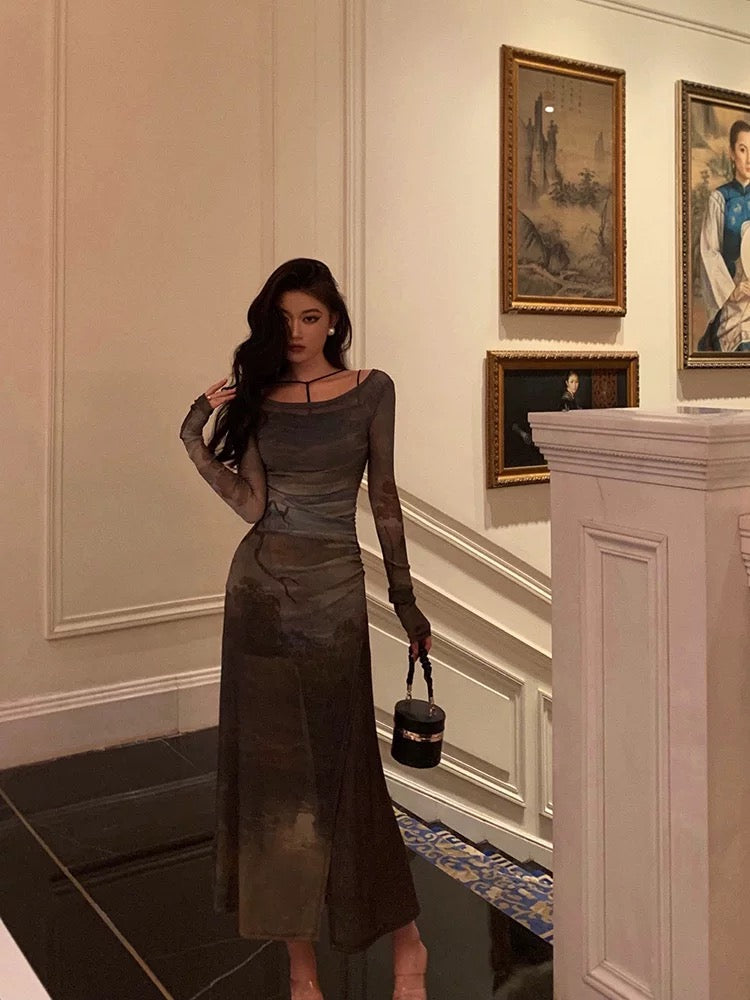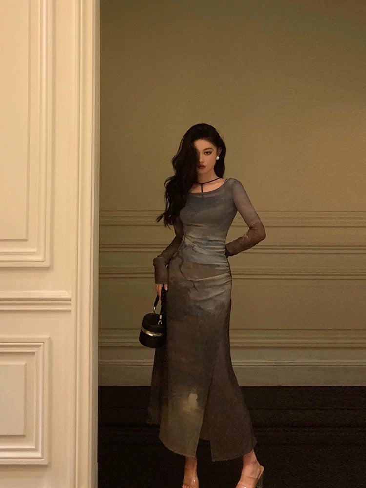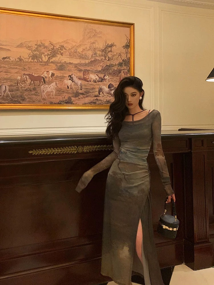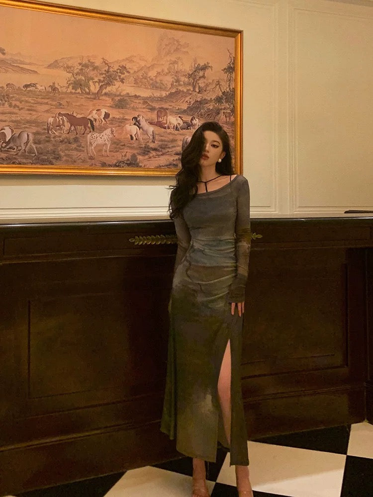 Sheath Floral 2 Pieces Long Sleeves Slit Prom Dresses Birthday Outfits SD311