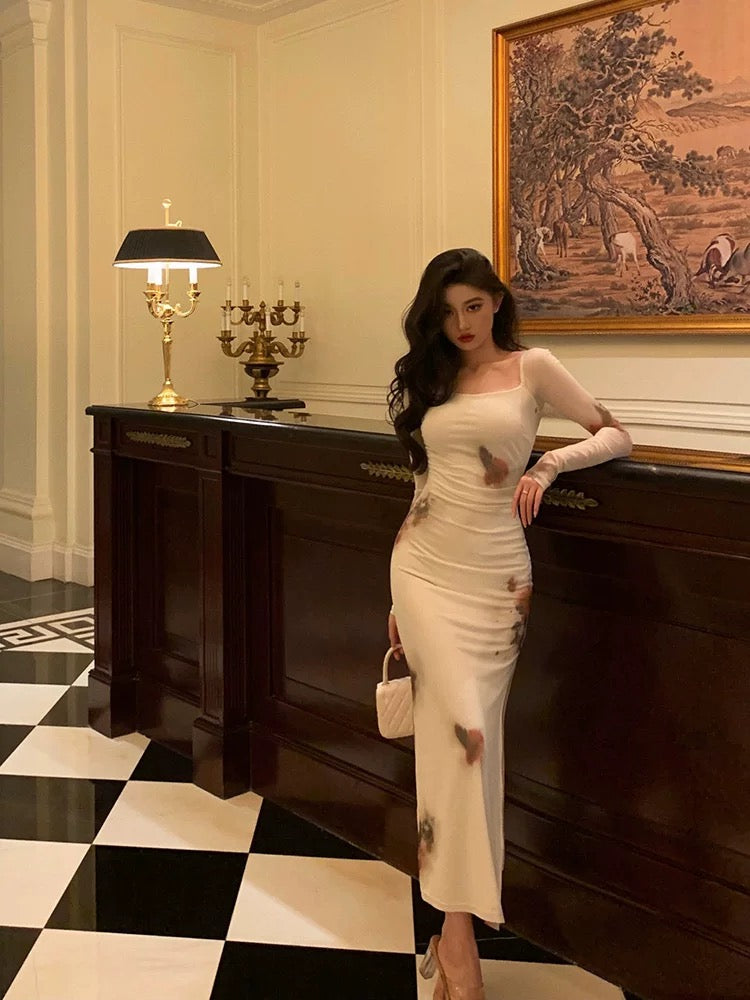 Sheath Square Neckline Long Sleeves Slit Floral Prom Dresses Birthday Dress SD411