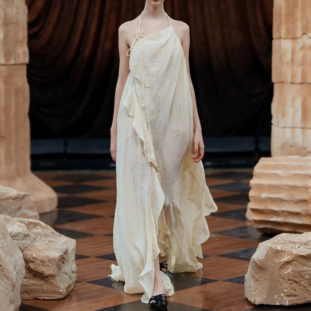 New Lotus Leaf Side Collar Hanging Neck-Loan Dress Seaside Holiday Atmosphere Dress