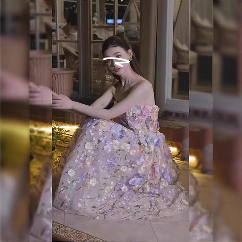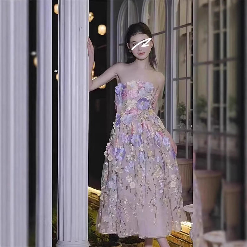 And Summer 2025 Color Three-Dimensional Flower Embroidery Mesh Splicing Bra Dress Dress Dress Woman