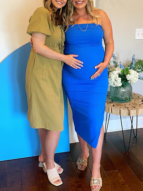 Blue Knit Bandeau Side Slit Strapless Bodycon Eleagnt Going Out Maternity Photoshoot Baby Shower Maxi Dress Maternity