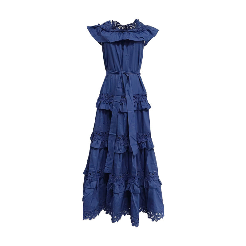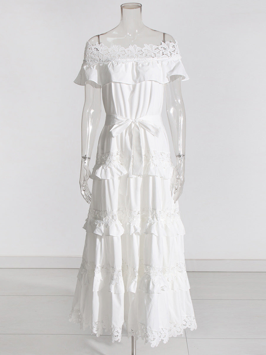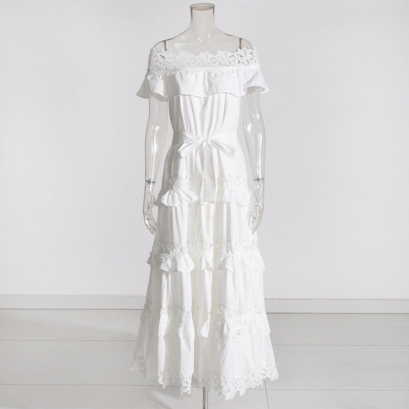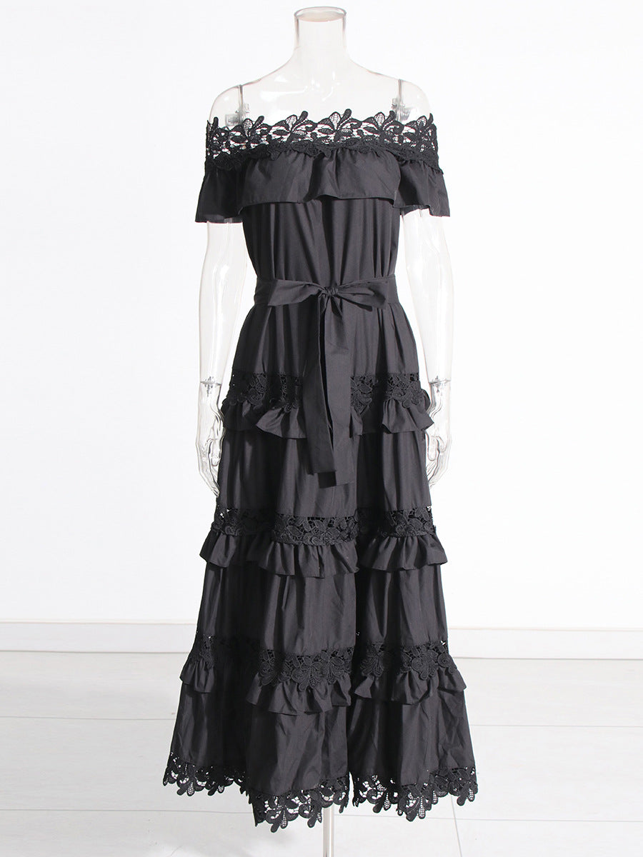 Court Style 2025 New Heavy Industry Lotus Leaf Side Shoulder Shoulder Lace Dress Solid Color Dress Woman