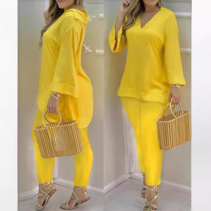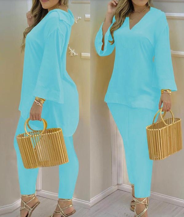 Explosion Color New Plain Horn Sleeve V Collar Top And Trousers Fashion Lady Set DJPT