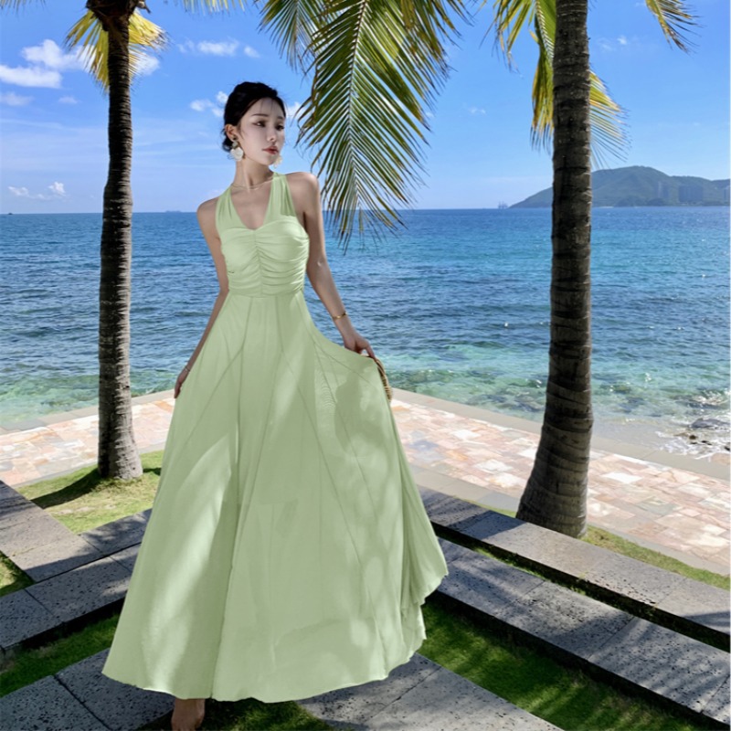 Fragmented Hanging Neck Dress Spring And Summer Holiday Wind Pure Lusty Folding V-Neck Net Yarn Long Dress Girl