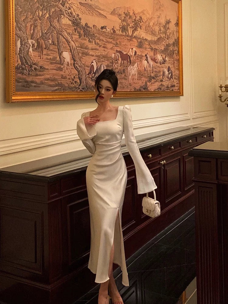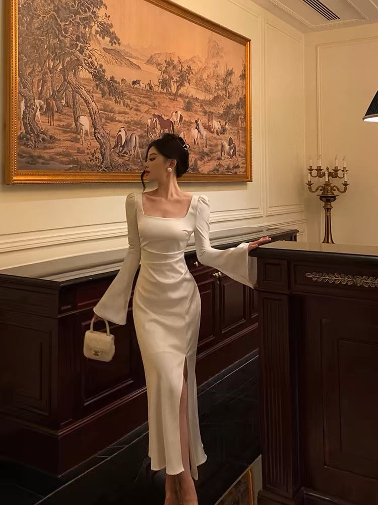 Mermaid Square Neckline Long Sleeves Slit Prom Dresses Birthday Outfits SD294