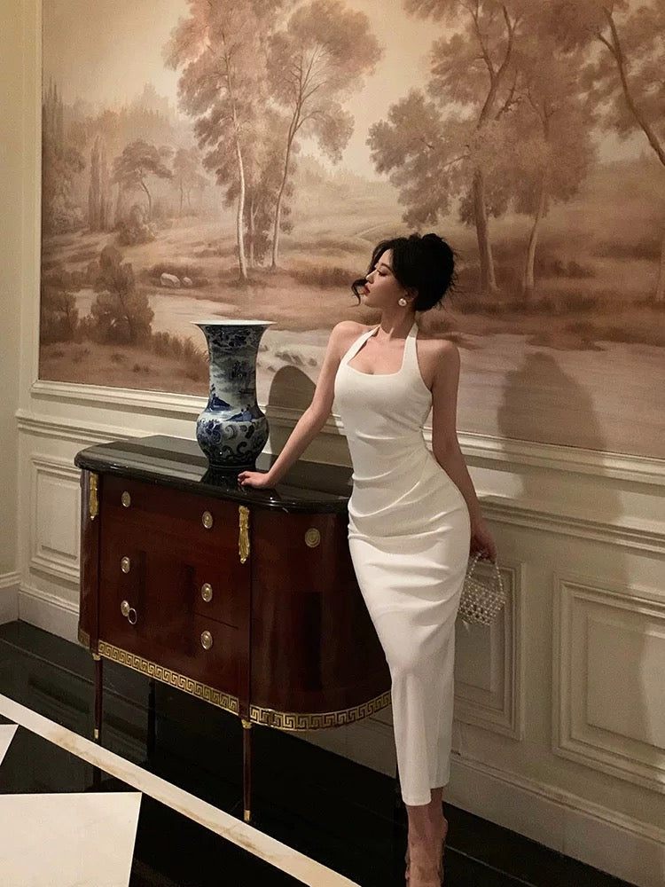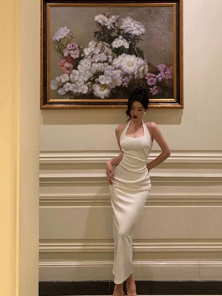 Sheath Halter Sleeveless White Tea Length Prom Dresses Birthday Outfits SD630