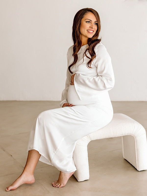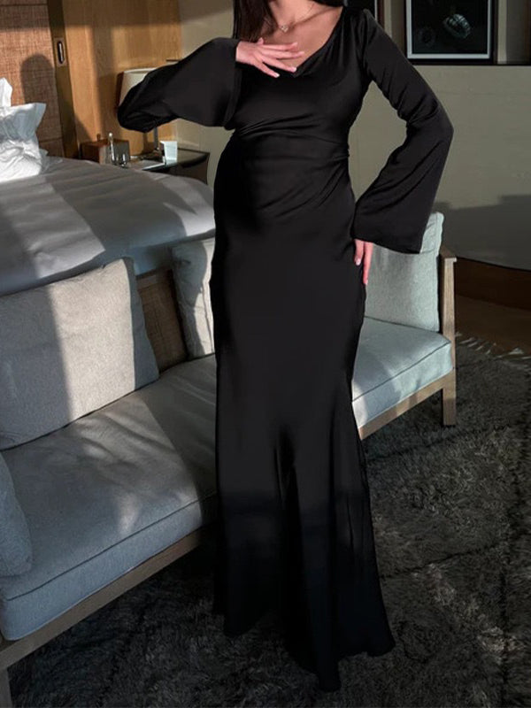 Silk Back Tie Solid Color Flare Sleeve Elegant Photoshoot Baby Shower Maternity Maxi Dress Maternity