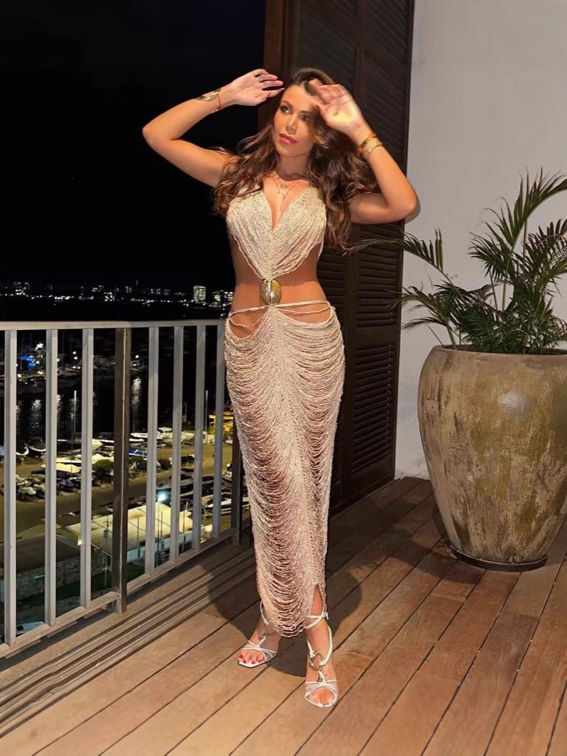 Spring And Summer Fashion Shell Esbead Hanging Neck Strap Sexy Body Butt Adjustable Long Skirt LX0135