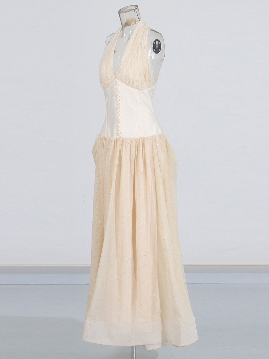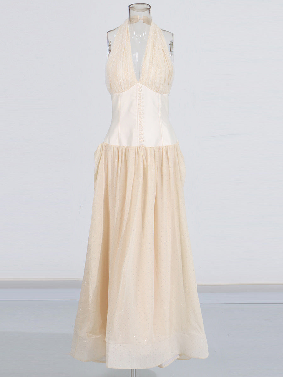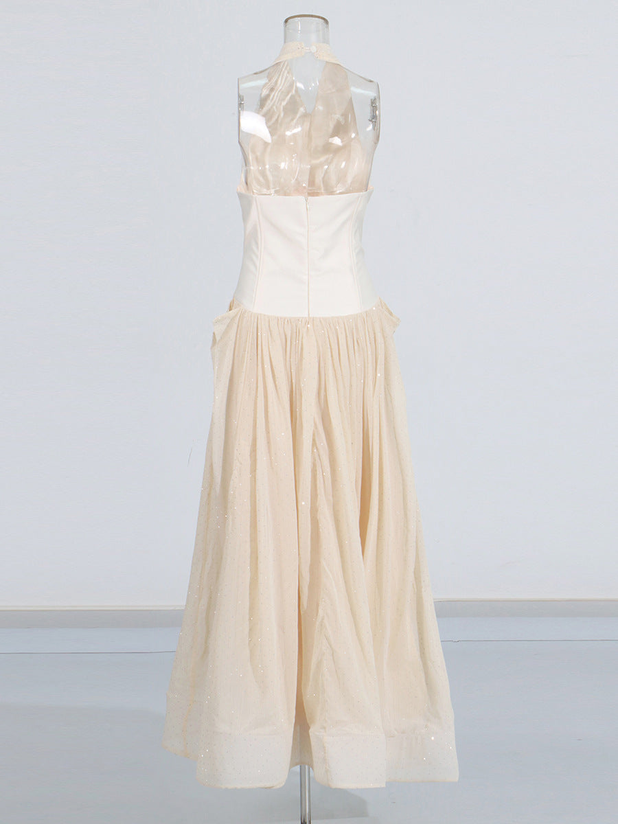 Style High-End Hanging Neck Cream Waist Dress 2025 New Lotus Hem Diamond Dress Dress