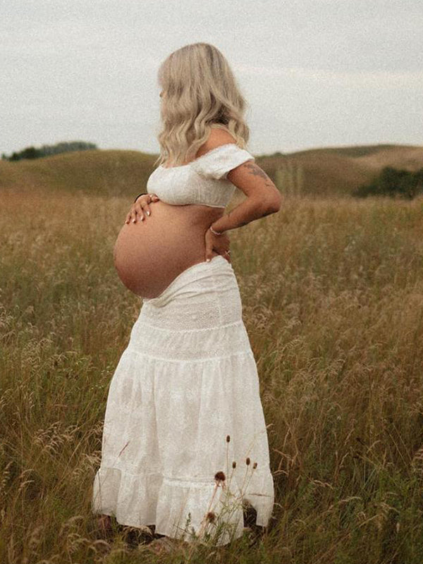 White 2-in-1 Lace Cut Out Off Shoulder Tie Elegant Flowy Vacation Photoshoot Maternity Maxi Dress Maternity