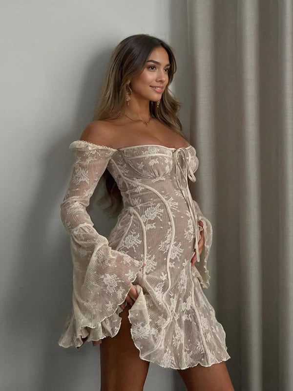 White Lace Off Shoulder Bow Drawstring Ruffle Flare Sleeve Elegant Baby Shower Maternity Mini Dress Maternity