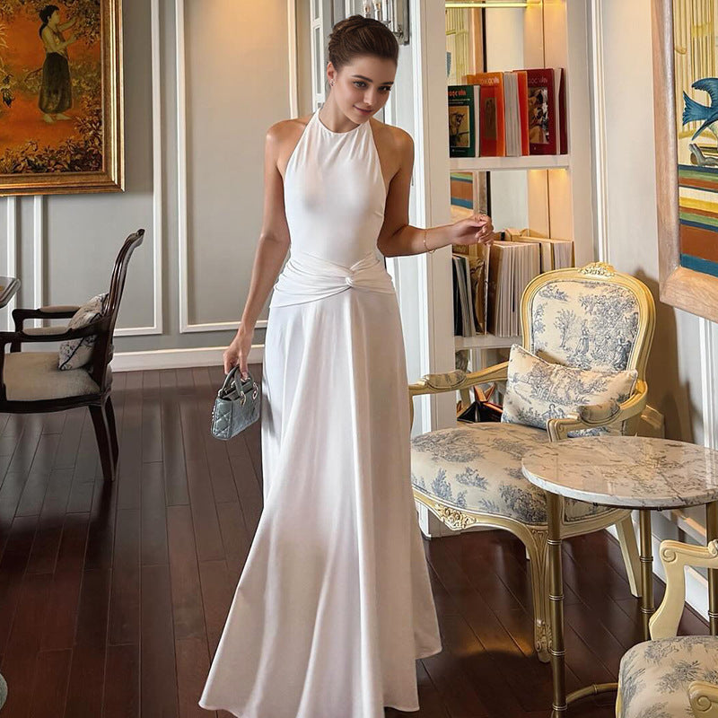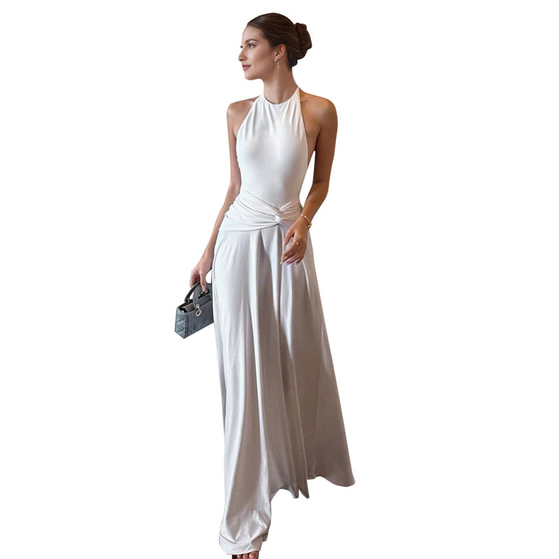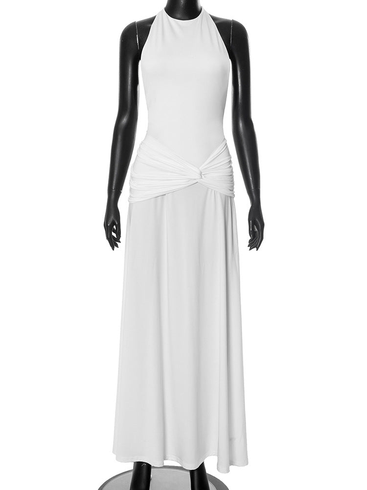 Women's Solid Color Sleeveless Hanging Neck Densified A-Shaped Long Dress DJPT