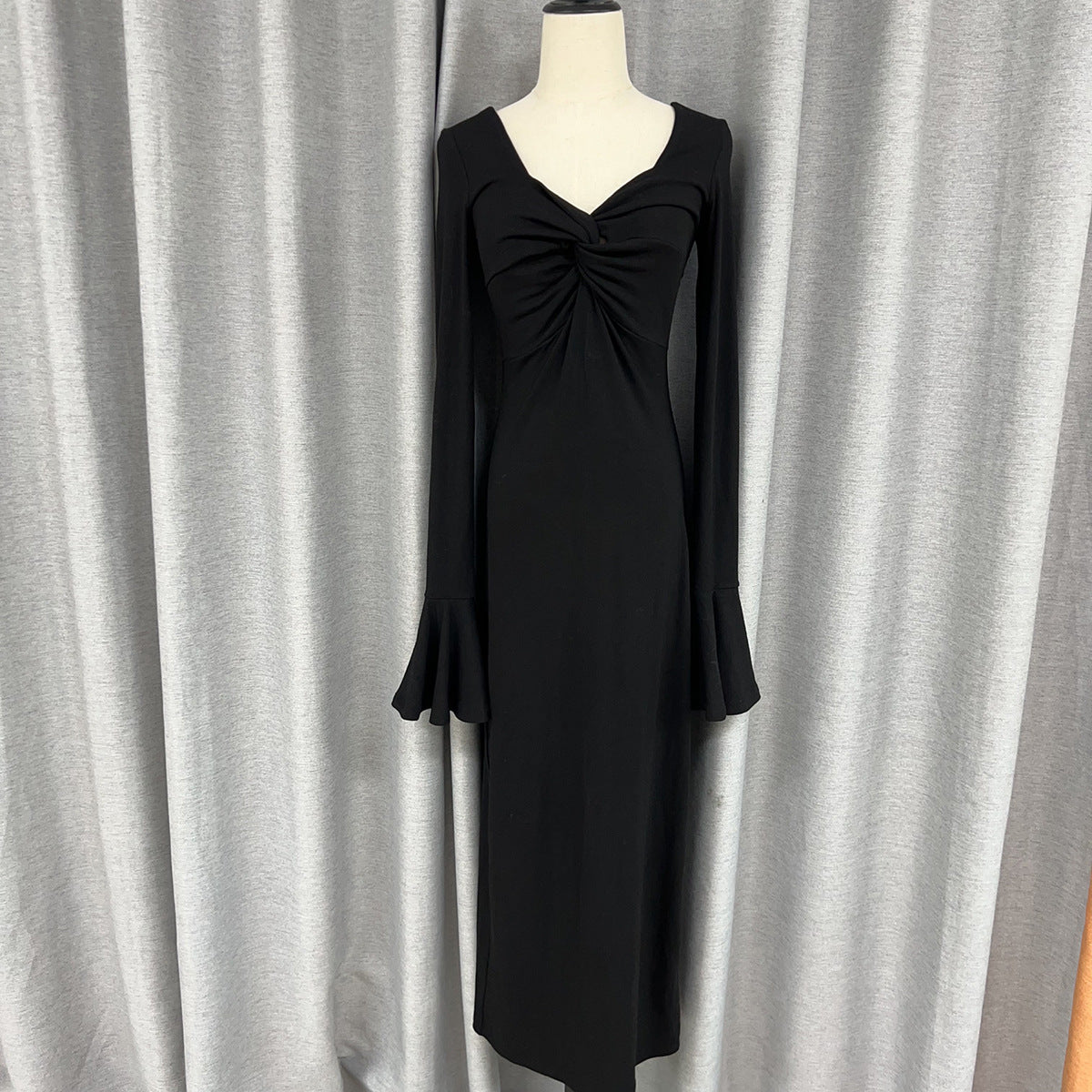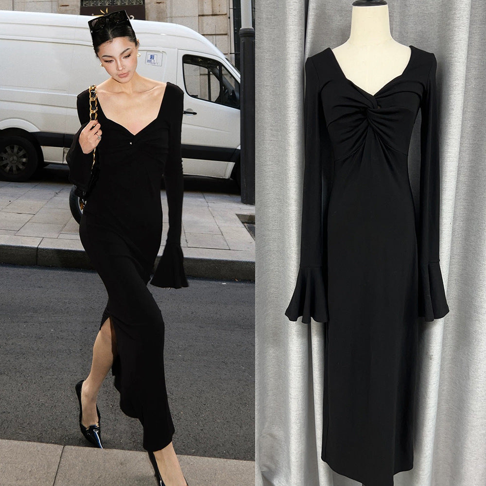 Zhao Sanguan Horn Sleeve Black Dew Dress 2024 New Elegant V-Neck Long Dress