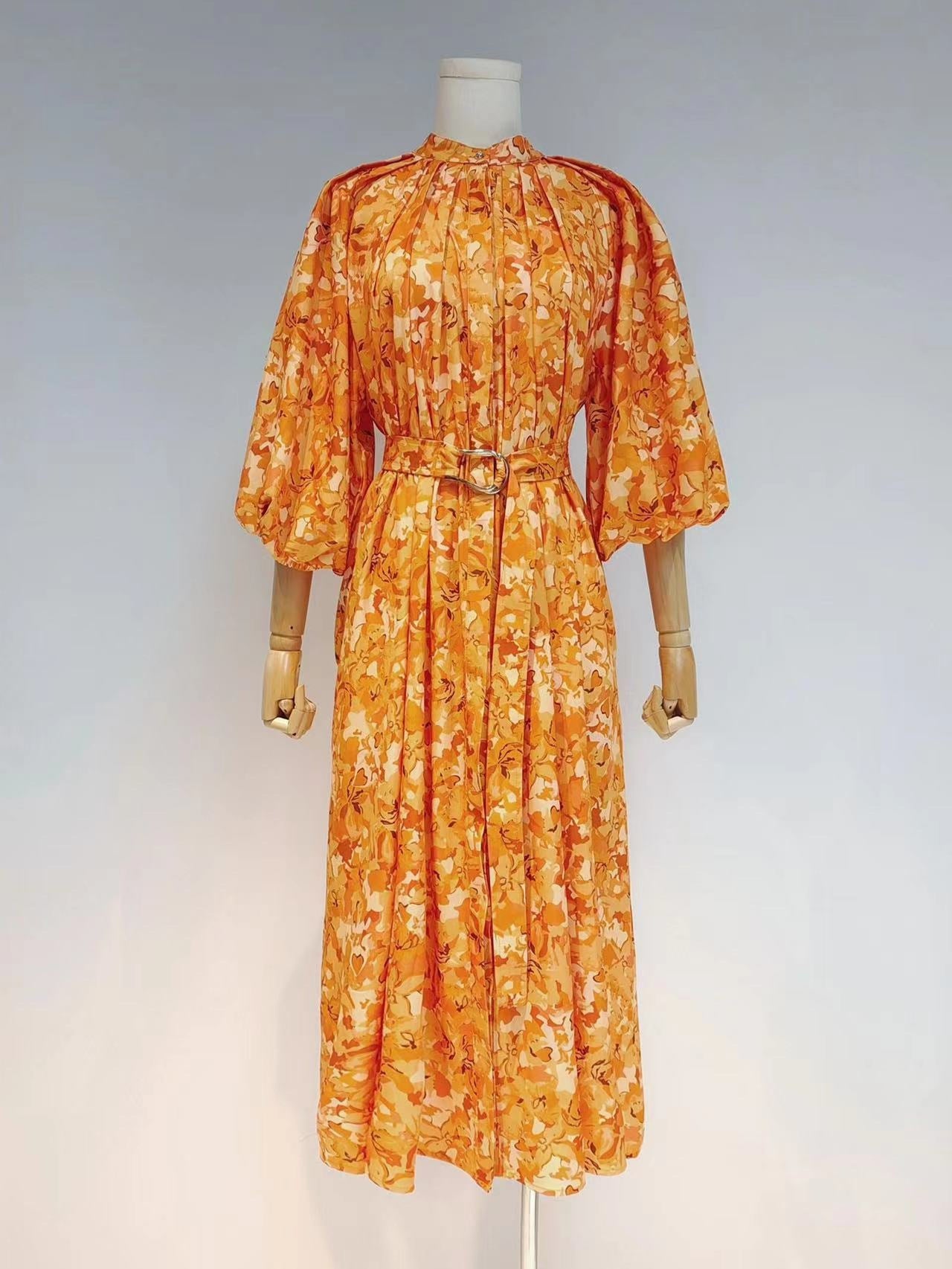 2024 New Collar Lantern Sleeve Single Buckle Belt To Collect Waist Long Dress Dress Woman