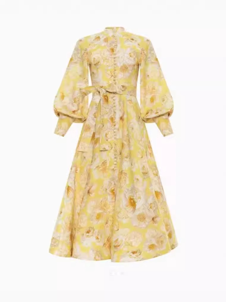 Autumn And Winter New Australian Tide Brand Retro Court Lantern Sleeve Single Buckle Floral Open Shirt Long Dress