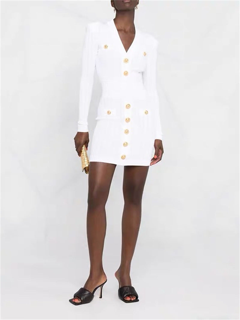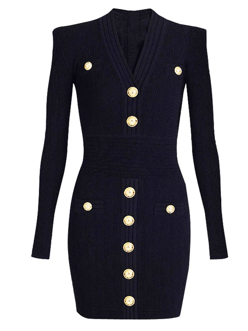 Autumn And Winter Pa Family Fashion Famous Woman Goddess Metal Buckle V-Neck Black Thin Knitted Dress
