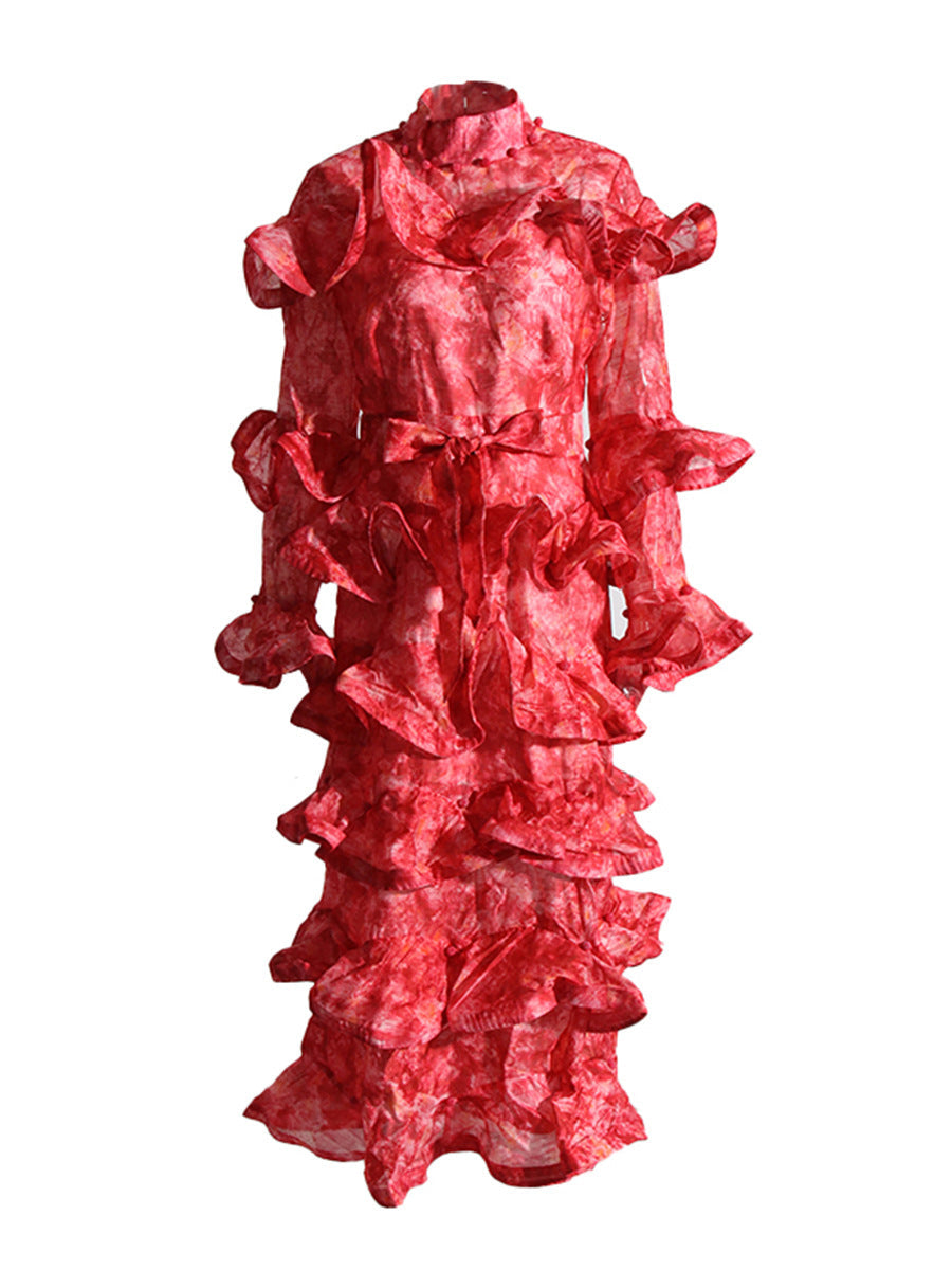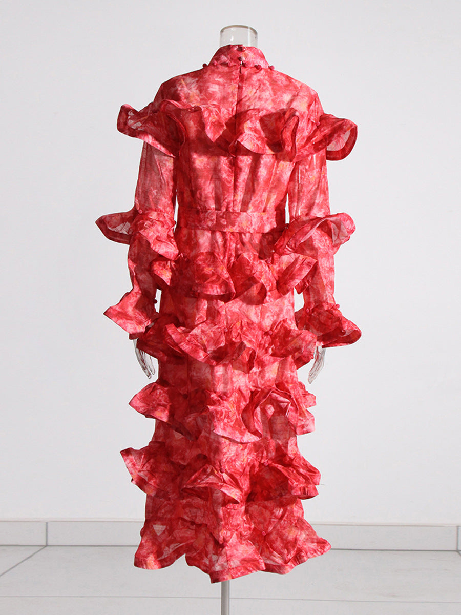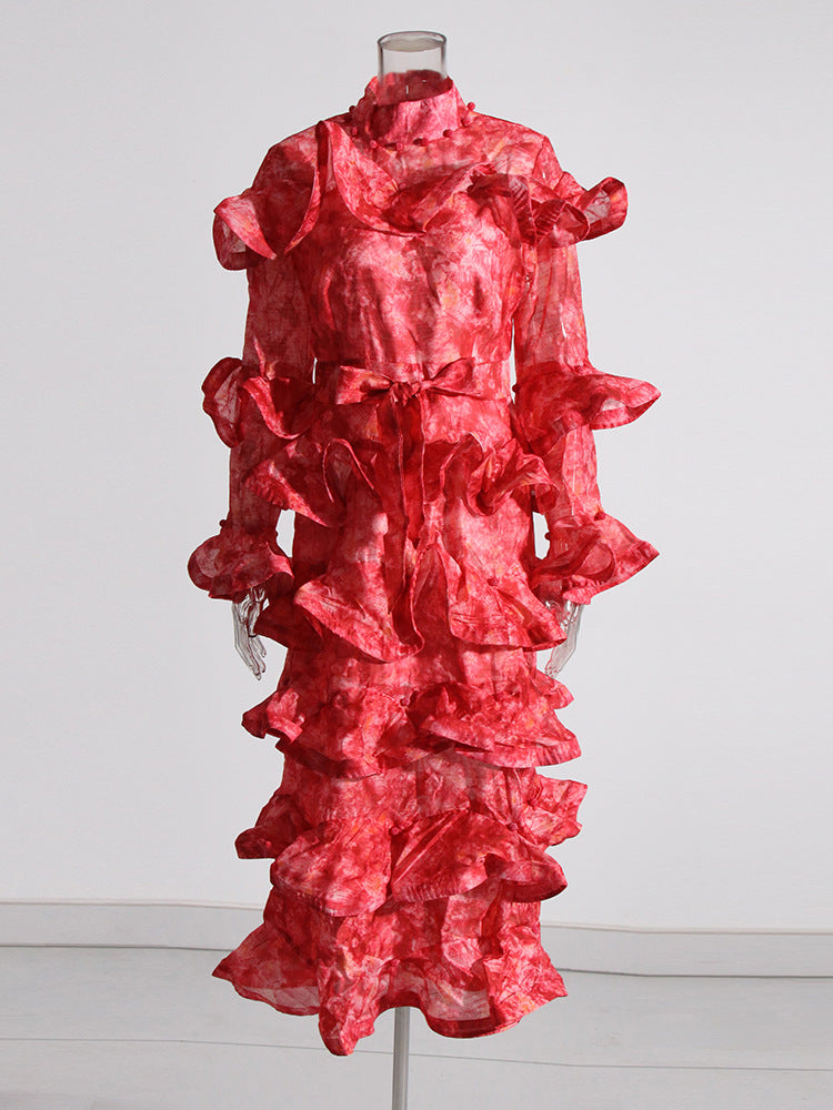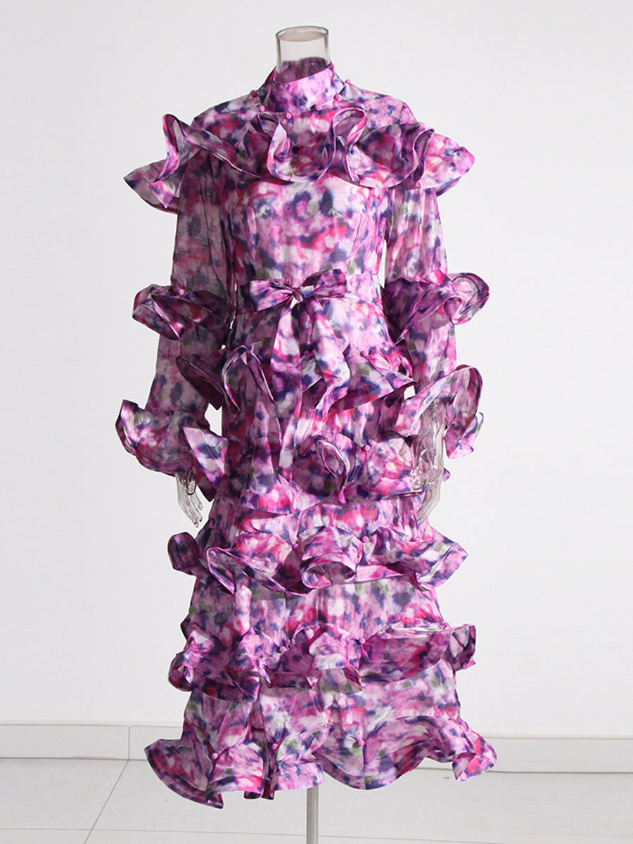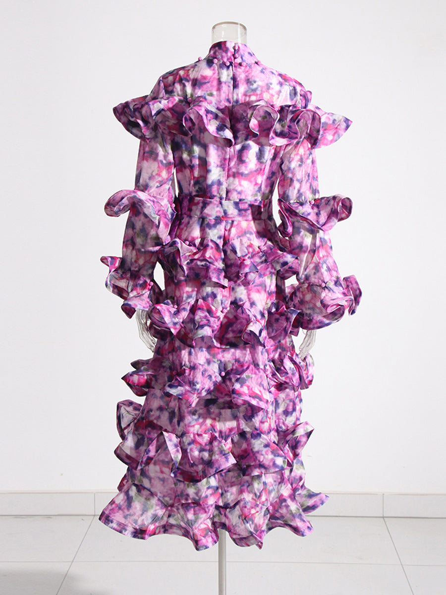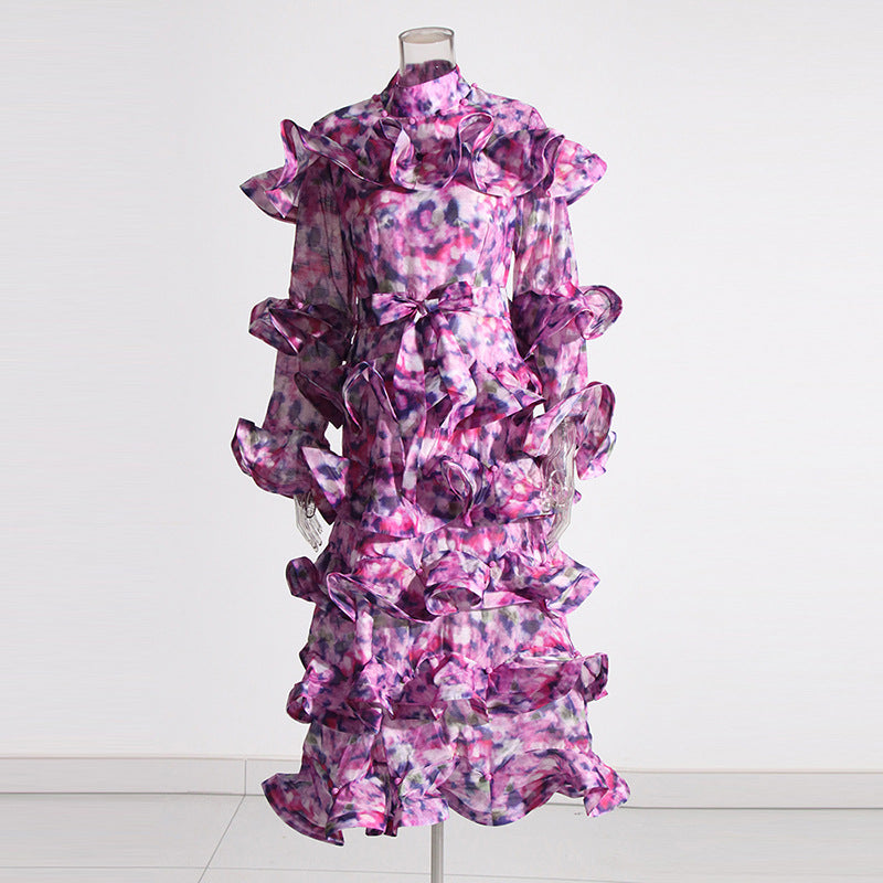 Court Style 2025 Summer Collar Long Horn Sleeve Design Lotus Side Hem Long Printed Dress