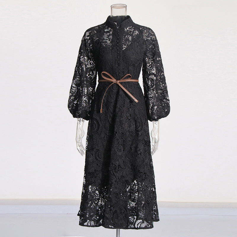 Elegant Retro Style Dress Woman 2025 Spring High-End Heavy Industry Lace Hollow Waist Dress