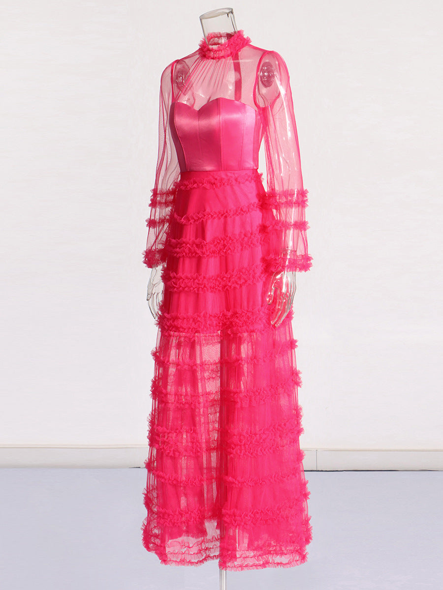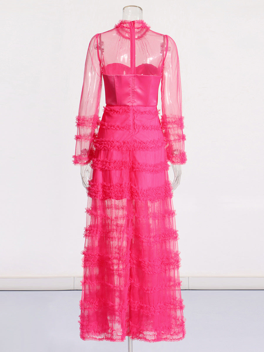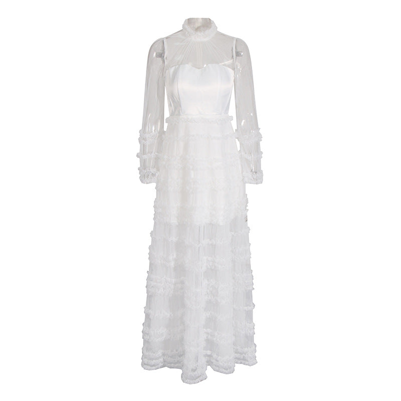 Elegant Style Dress 2025 Summer New Fashion Round-Collar Mesh Splicing High-End Perspective Cake Skirt