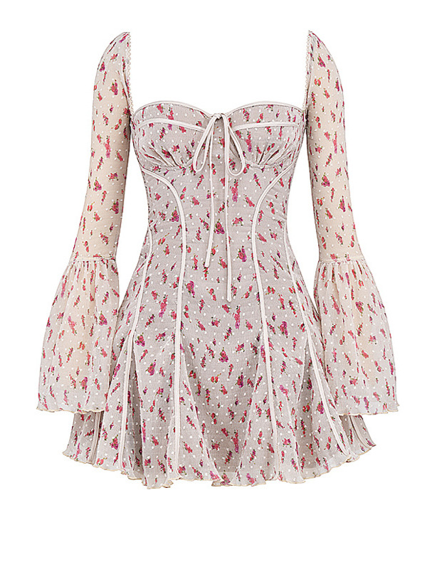 Lace New French Lightweight Heavyweight Short Dress Horn Sleeve Fish Bone Printed Dress Sexy Spice Girl HZ0628