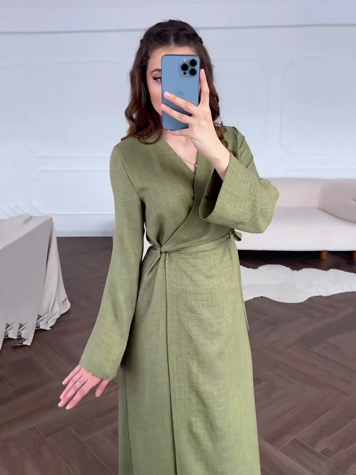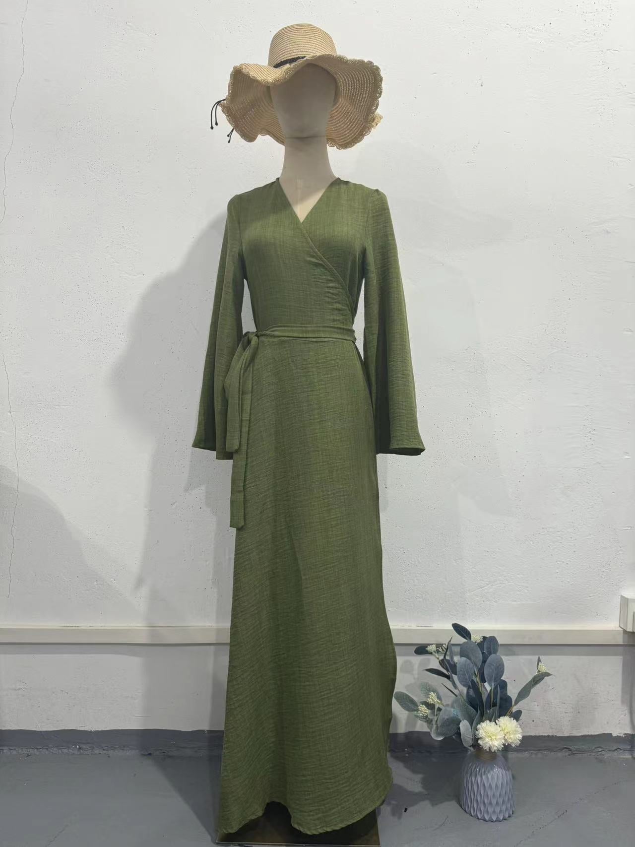 Long-Sleeved Dress 2024 Summer Cold Feeling With Belt V-Neck Zen Style Dress