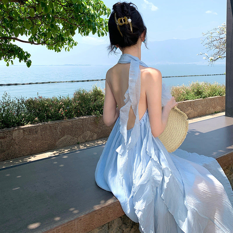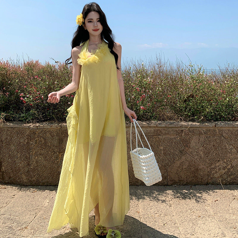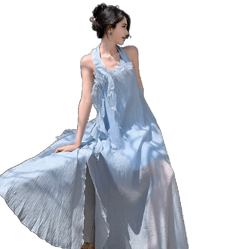Luxury Small Loose Blue Hanging Neck Morning Robe Three-Dimensional Flower Beach Dress Dress Bridal Dress Female