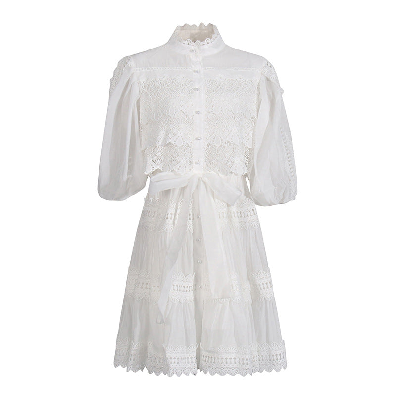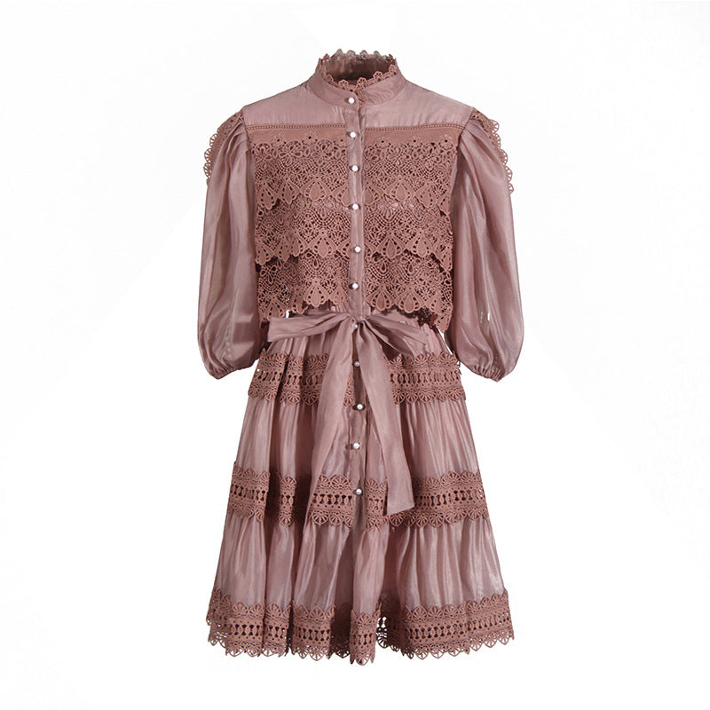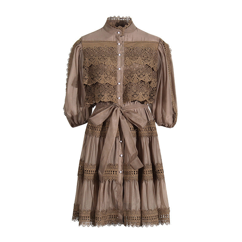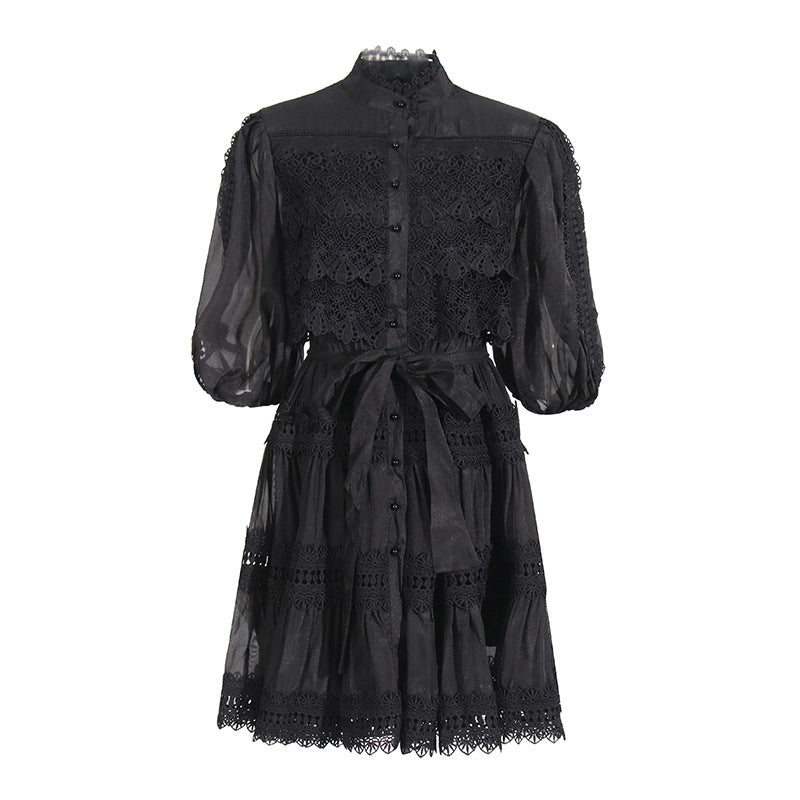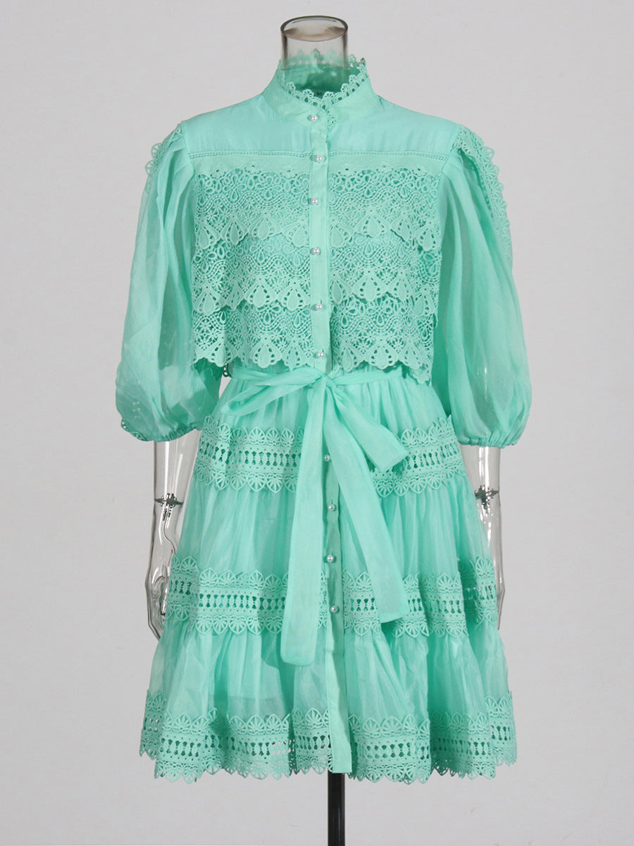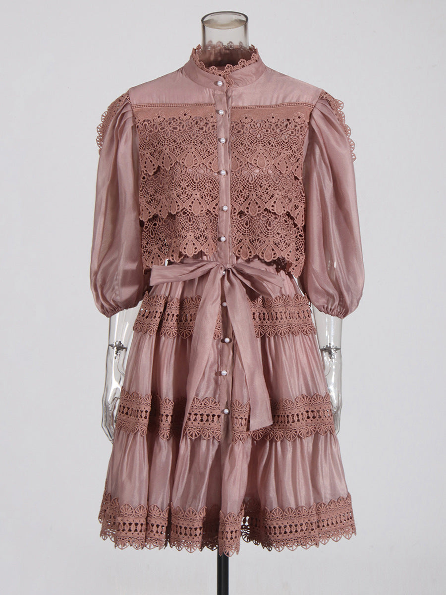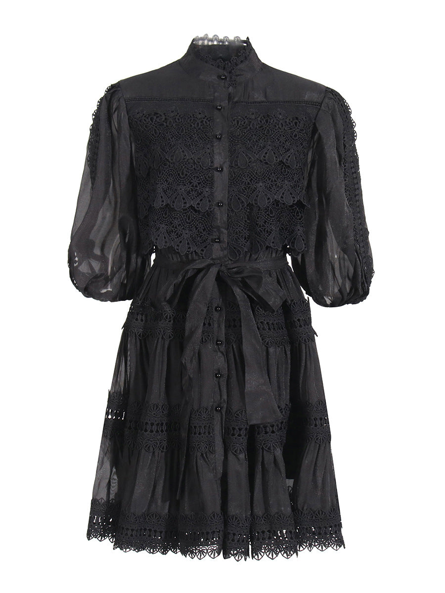 Luxury Wind Hollow Lace Splicing 2025 Summer New Lantern Sleeve Buckle Long Solid Female Dress