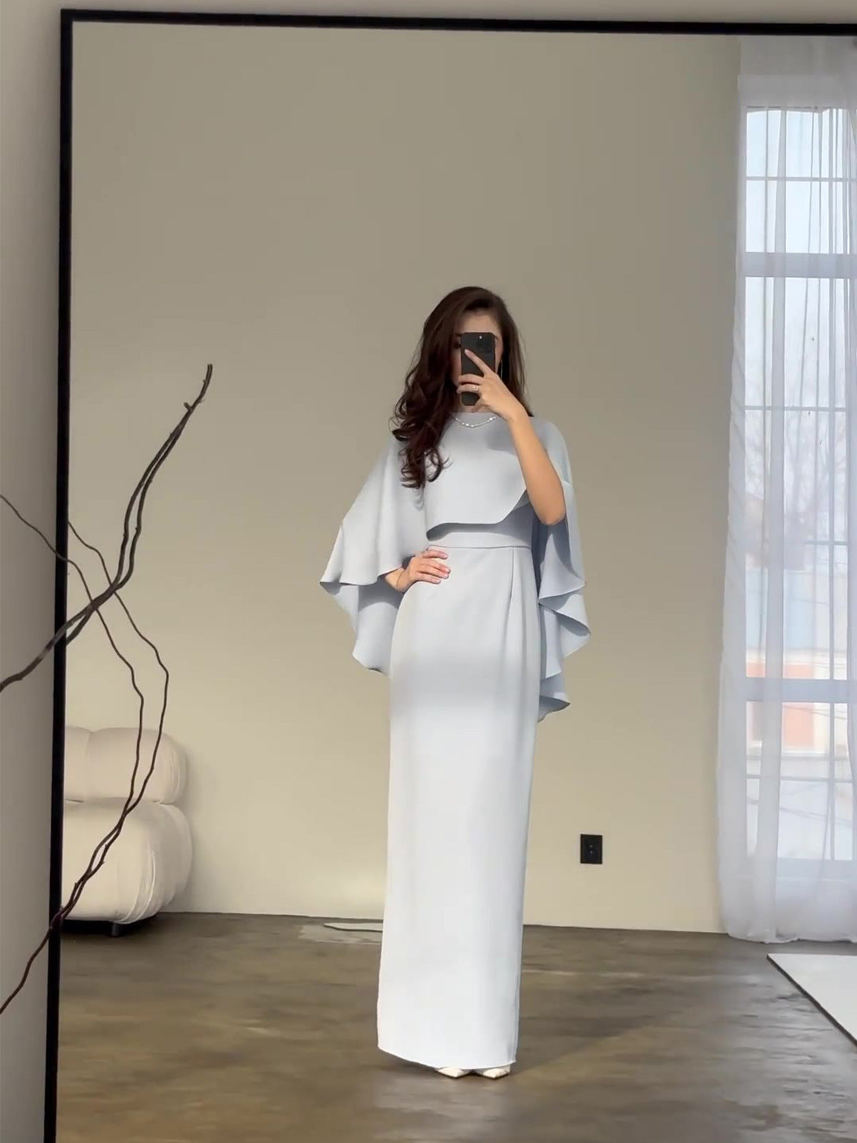 New Solid-Colored Set Of Fassing Bat Shawl Temperament Waist Long-Sleeved Dress