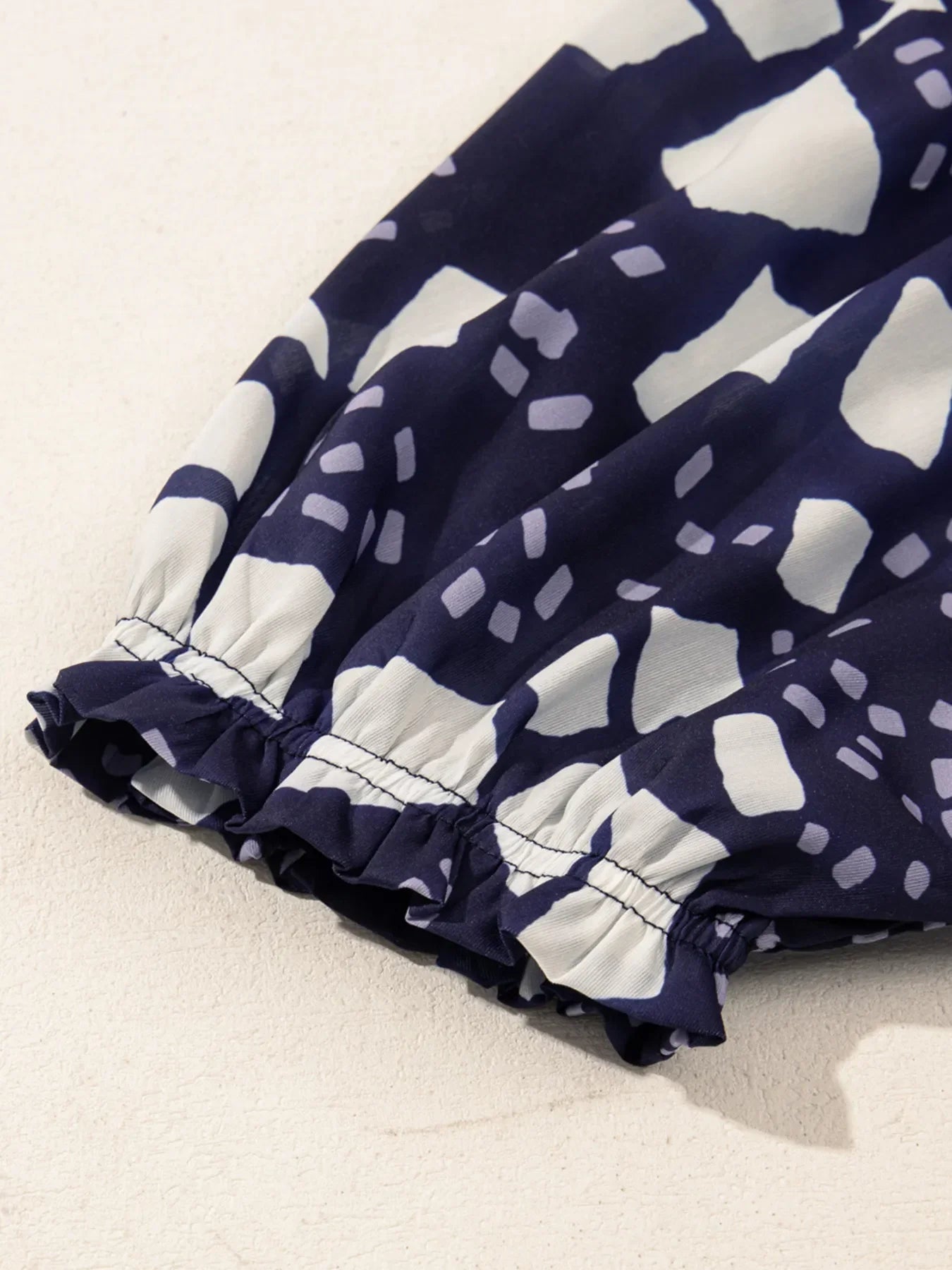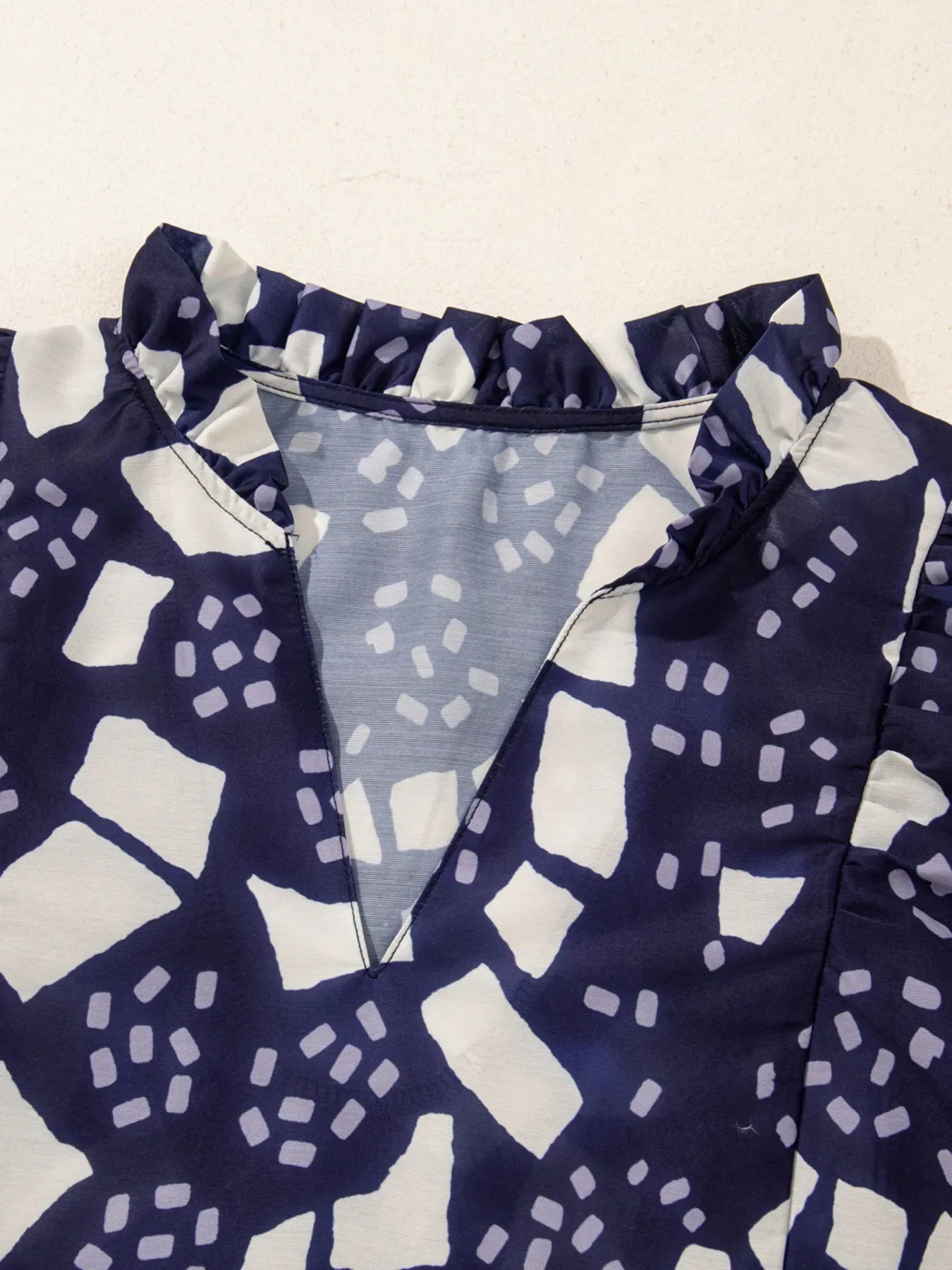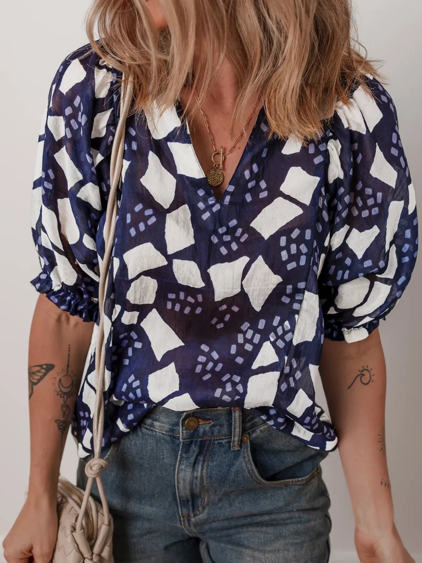 Print Frilled Puff Sleeve V Neck Blouse DJPT