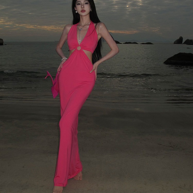 Seaside Holiday Hottie Dress Hanging Neck Sexy Splicing Hollow Bag Hip Skirt Strap Banded Back Dress Girl