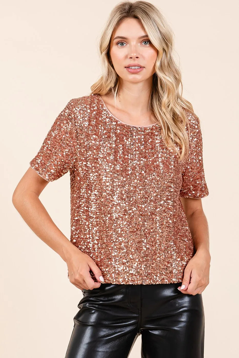 Sequin Short Sleeve Round Neck Cropped Blouse DJPT