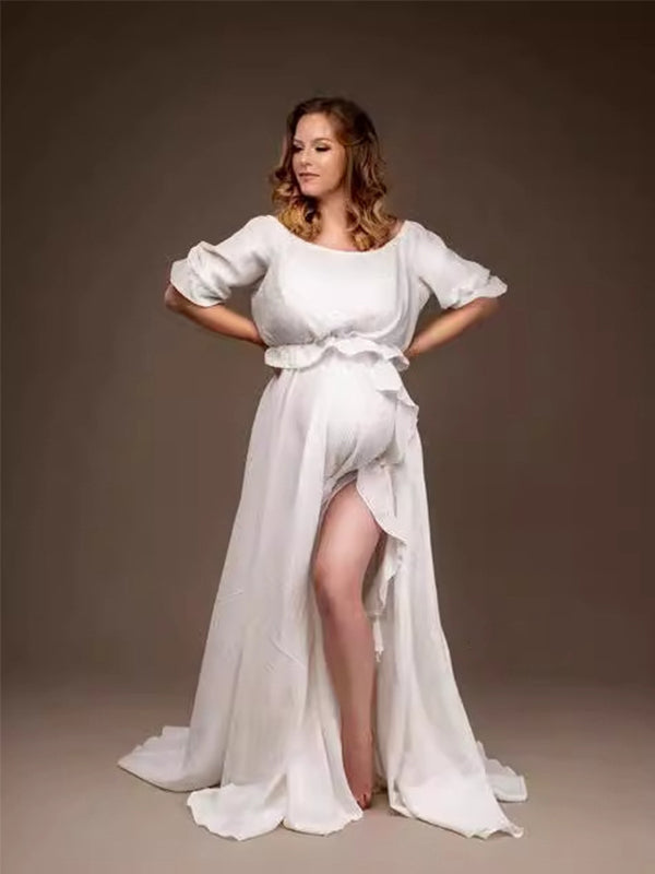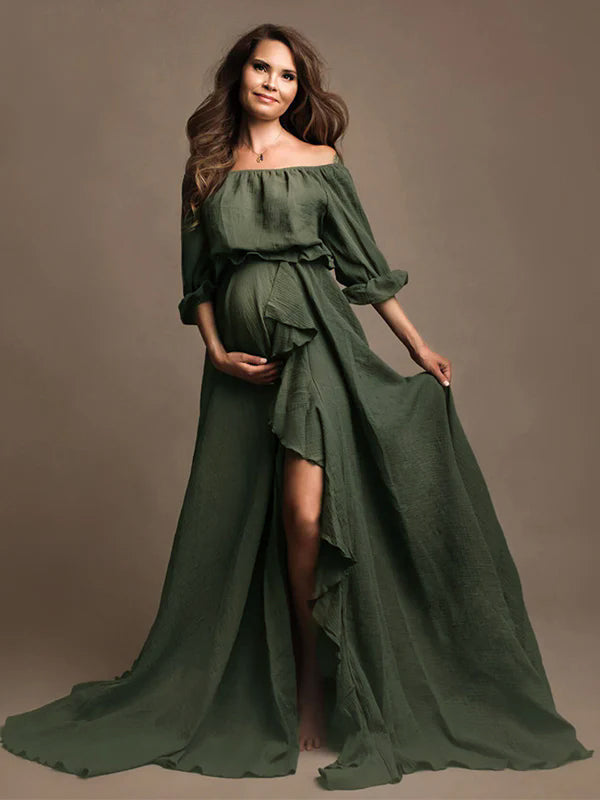 Solid Color Off Shoulder Backless Ruffle Crop Side Slit 2-in-1 Photoshoot Maternity Maxi Dress Maternity
