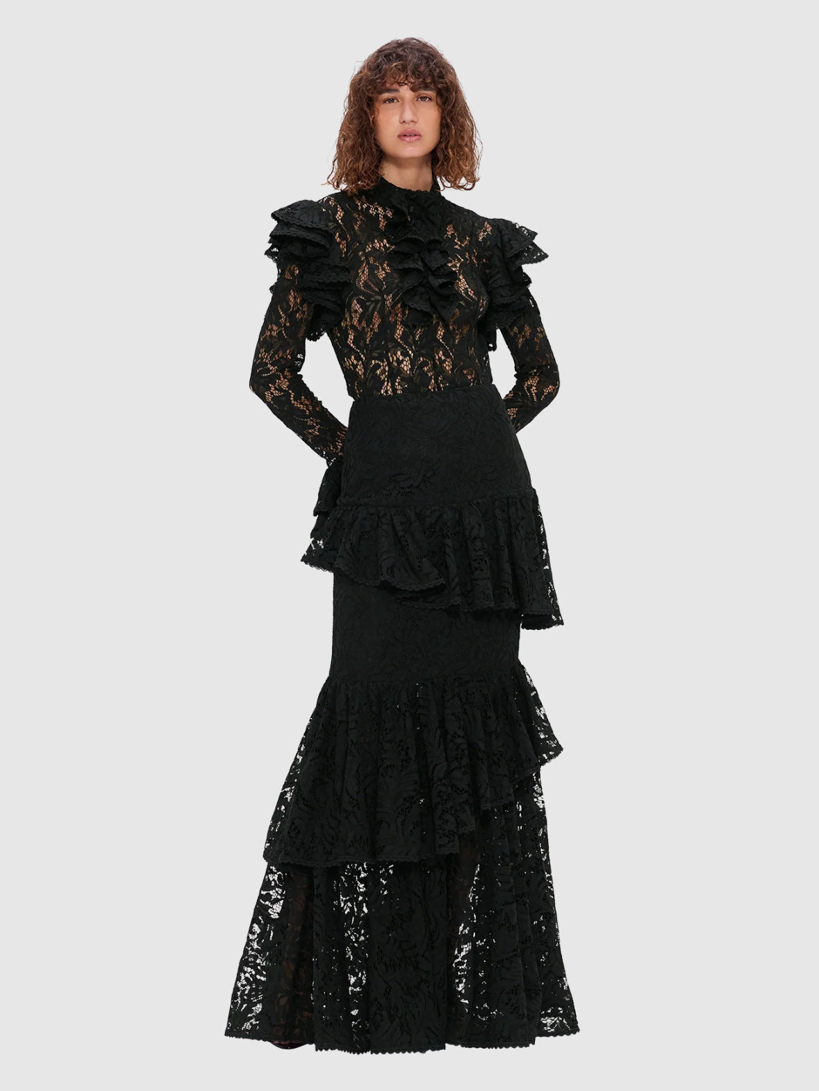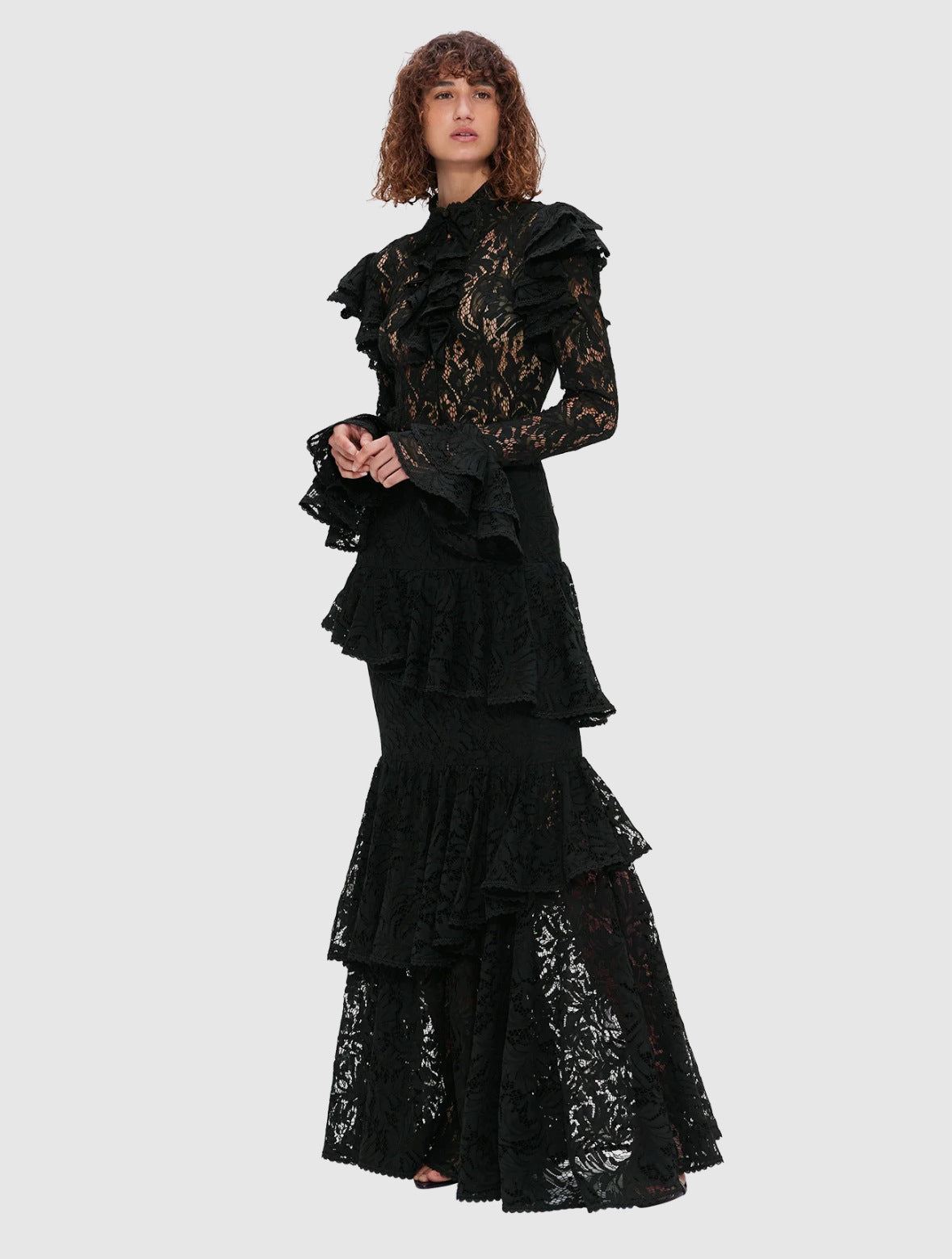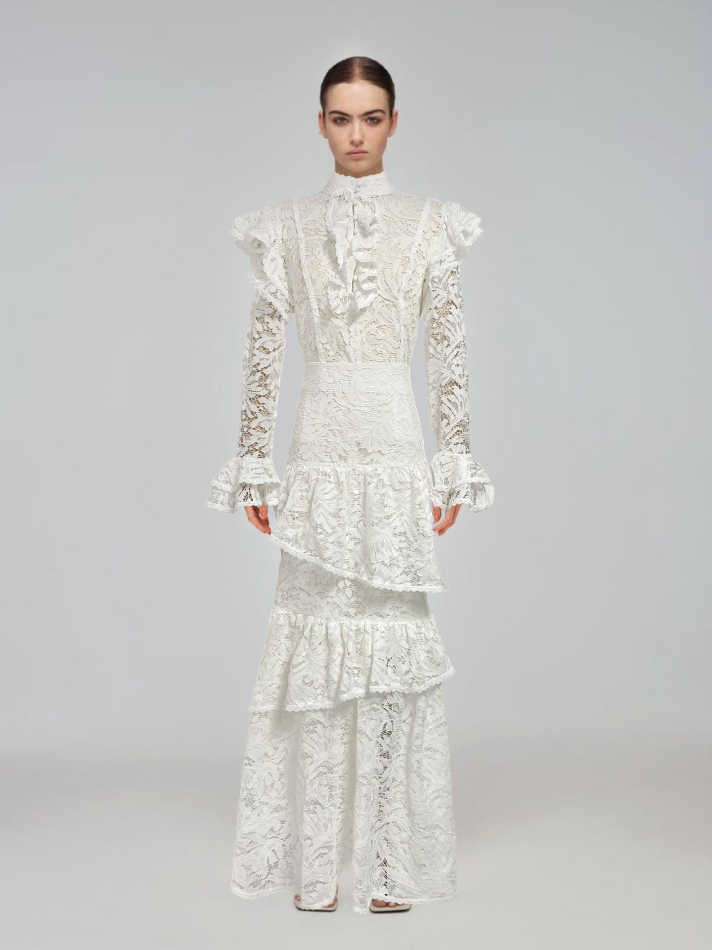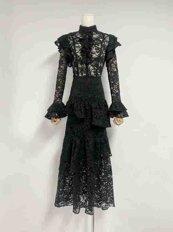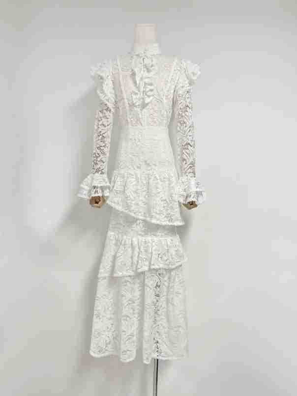 Summer New Collar Horn Long Sleeve With Waist Hollow Lace Dress Suit Woman