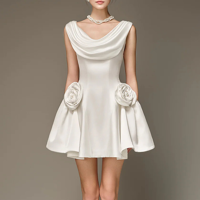 Summer New Round Neckless Design High-Waist Three-Dimensional Flowers Spliced Solid Color French Retro Short Skirt Woman