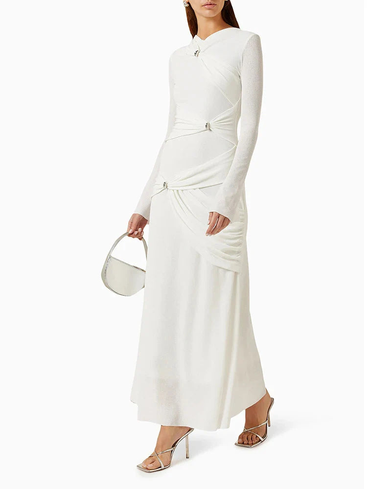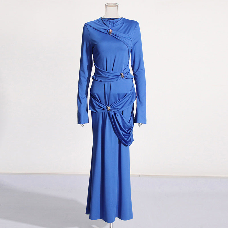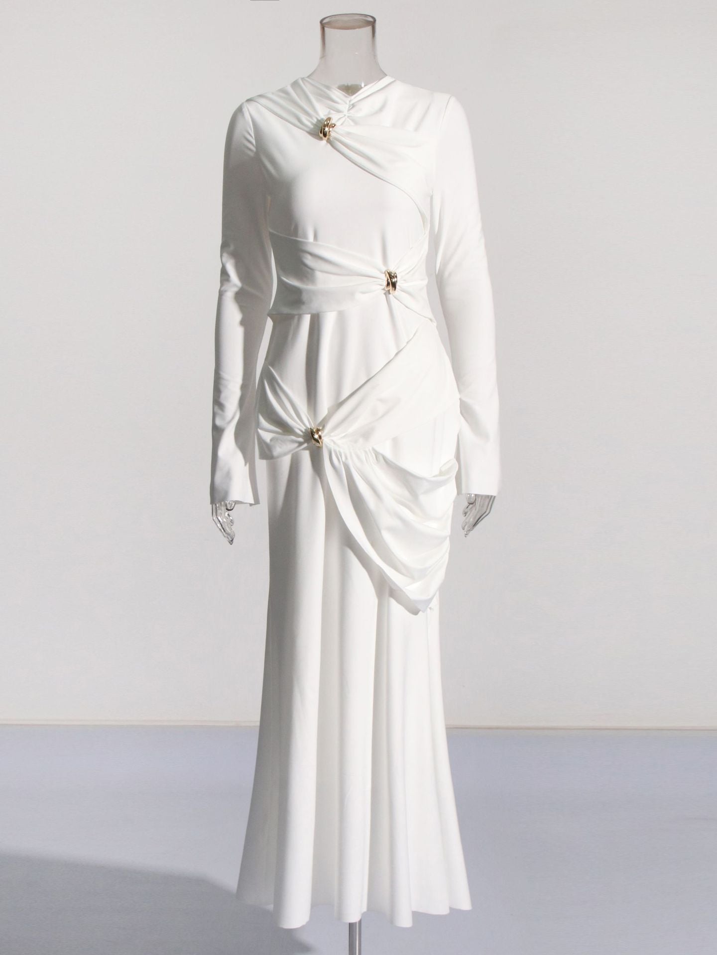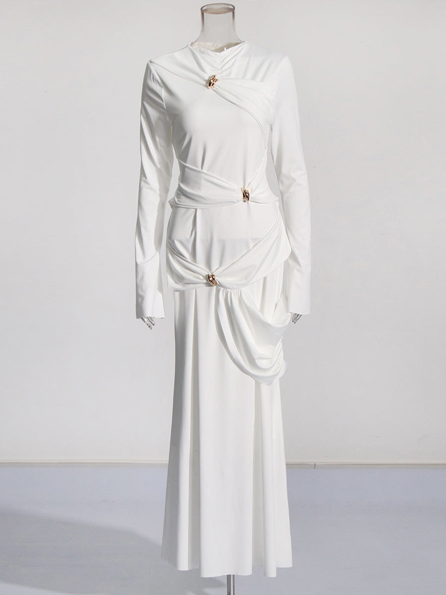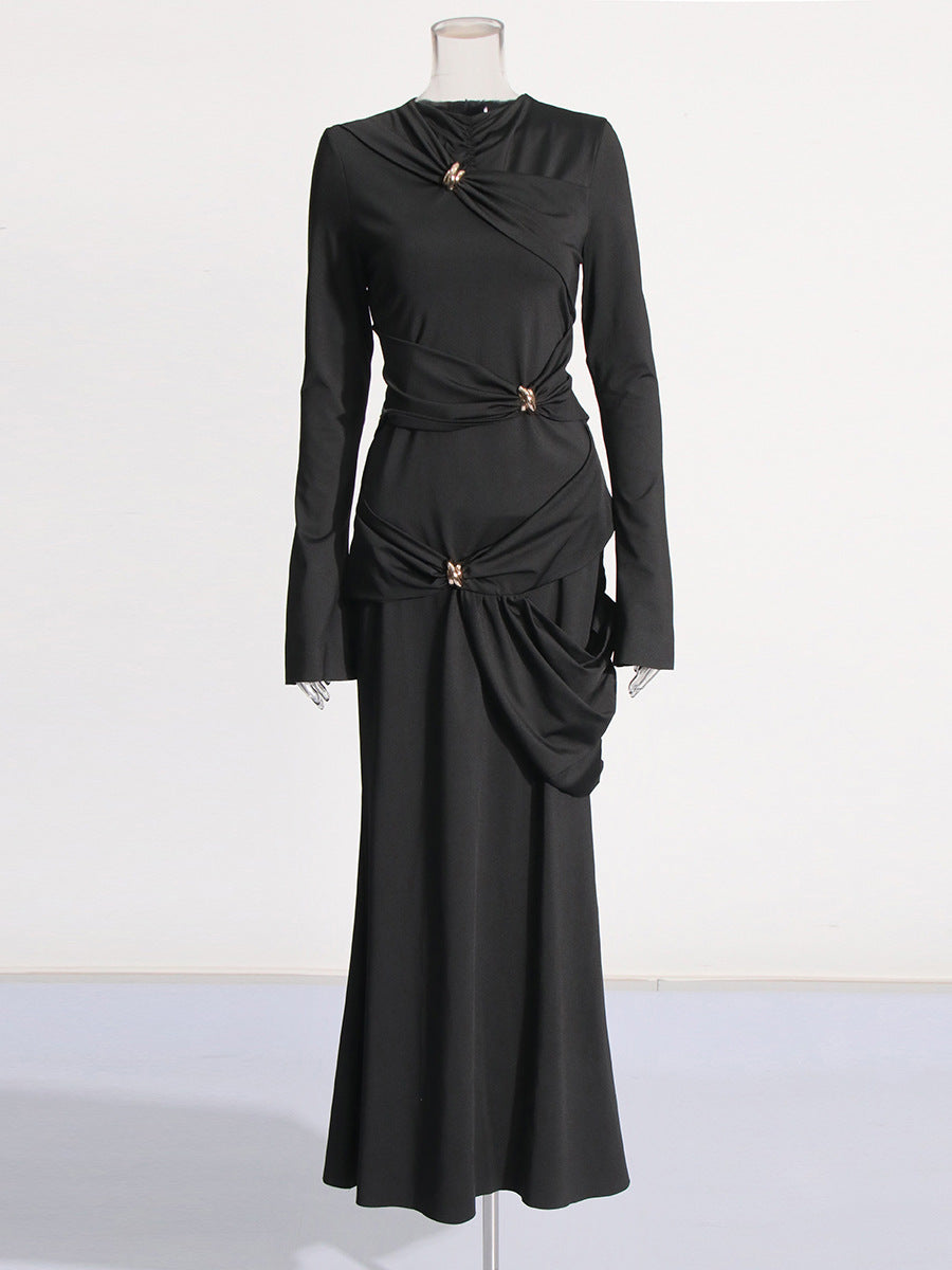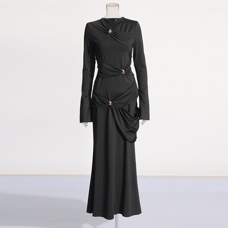 Temperament Famous Wind Style T-Shirt Dress 2025 Spring New Round Collar Kinesge Metal Buckle Folded Knitted Dress Woman