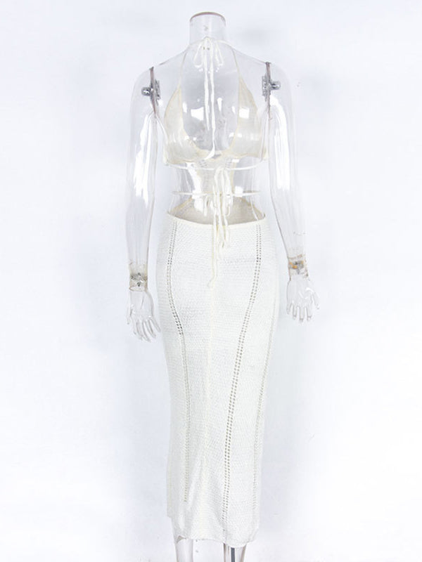 White Crochet Cut Out Backless Halter Neck Bodycon Chic Vacation Open Belly Maternity Dress Maternity