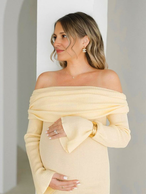 Yellow Knit Off Shoulder Flare Sleeve Mermaid Bodycon Elegant Vacation Photoshoot Baby Shower Maternity Maxi Dress Maternity