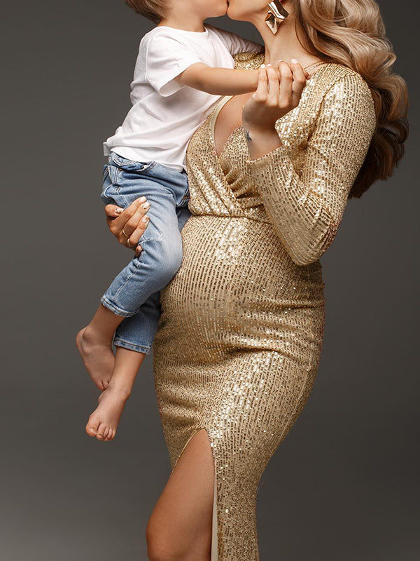 Introducing our stunning gold sequin maternity dress, featuring a side slit, V-neck, and long sleeves. This dress is perfect for autumn and winter occasions such as baby showers, maternity photoshoots, holiday gatherings, and Christmas parties. Its elegant design and shimmering gold sequins will make you stand out and feel fabulous during the colder months. Add a touch of glamour to your maternity wardrobe with this versatile and eye-catching dress!
