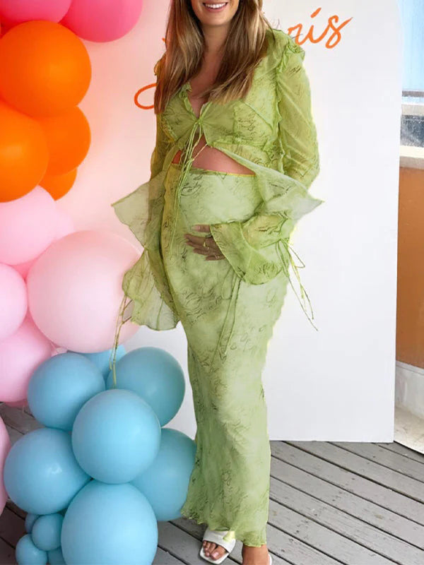 2 Piece Mesh Print Ruffle Tie Slit Flare Sleeve Vacation Photoshoot Baby Shower Maternity Maxi Dress Maternity