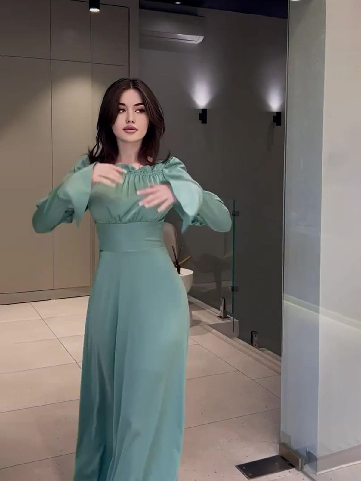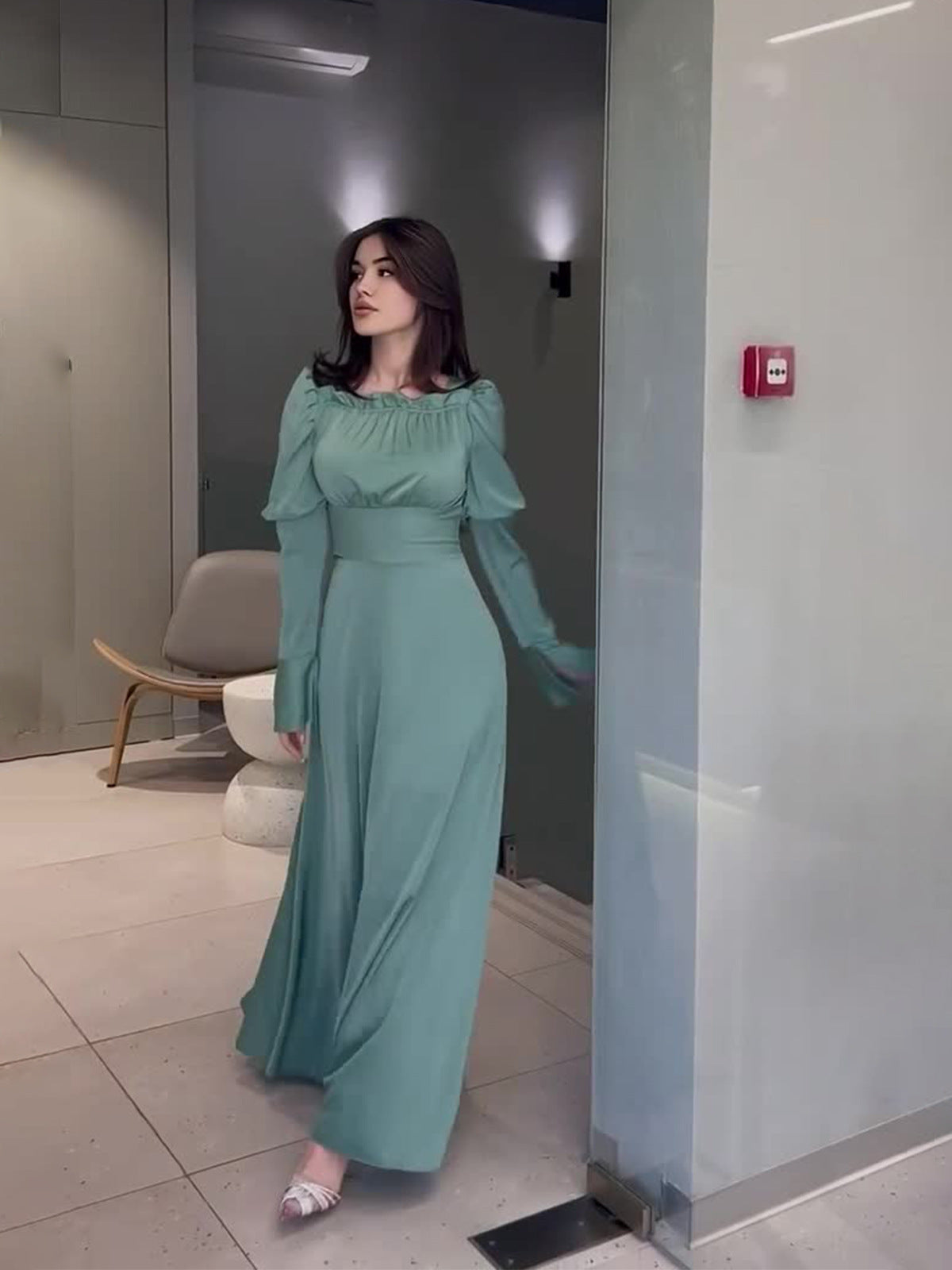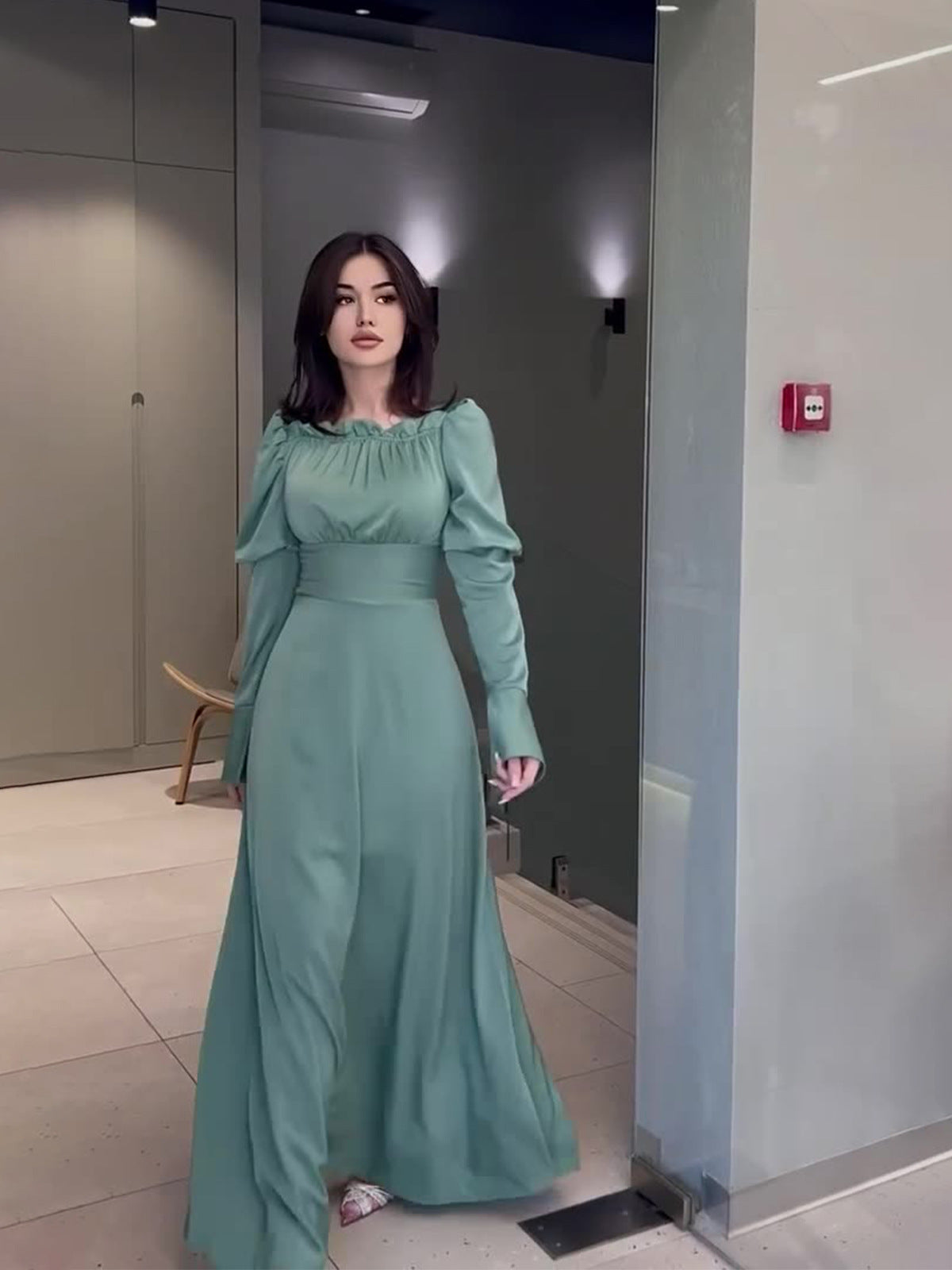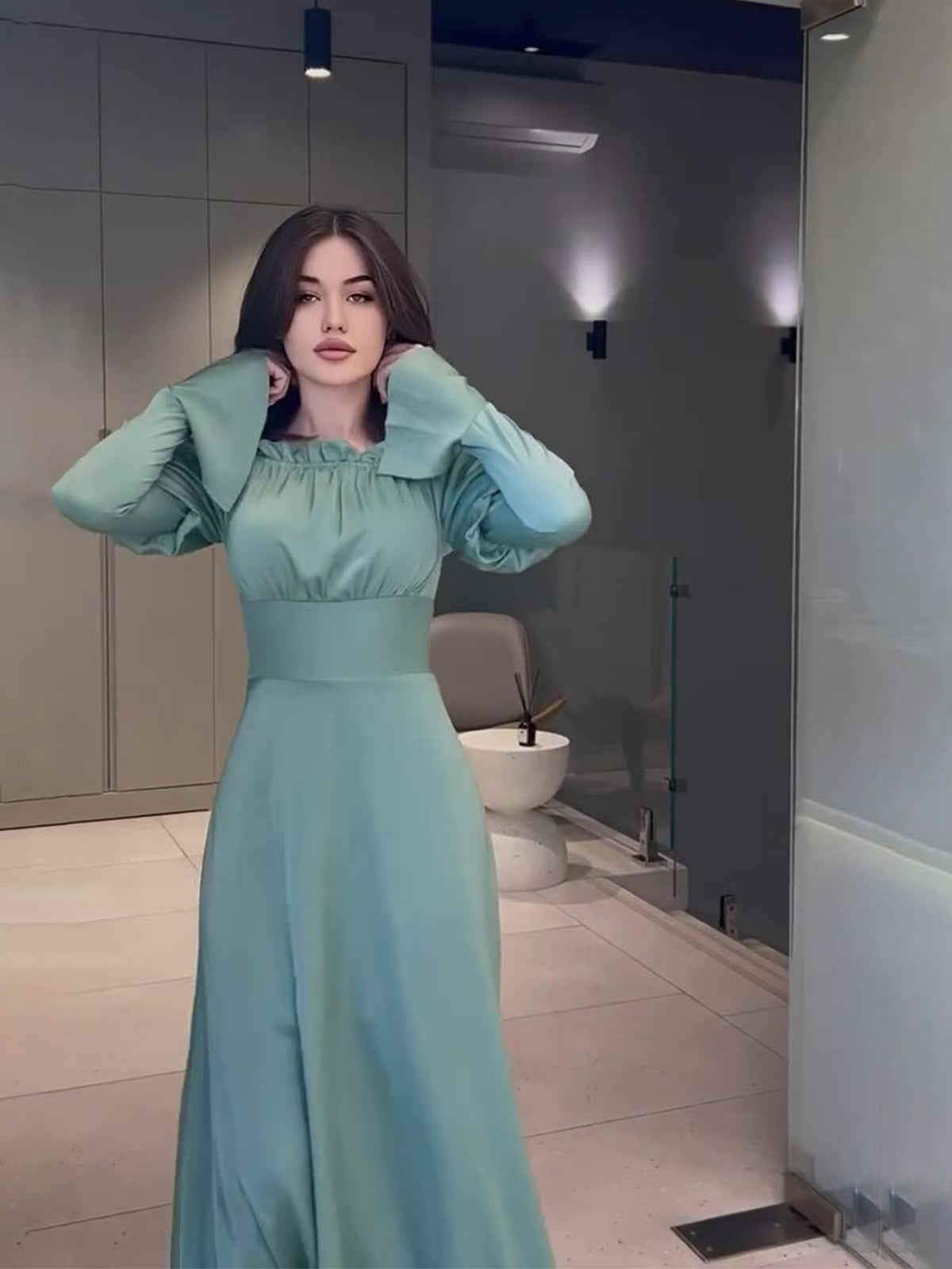 2024 Court Style Bubble Collar Wood Ear To Collect Waist Solid Color Long Sleeve Dress