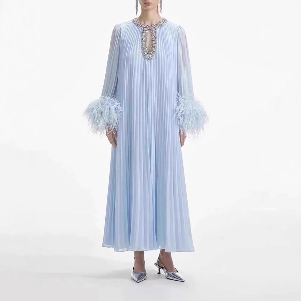 2025 Cuffed Ostrich Hair Decoration Dress Neck Collared Diamond Dress