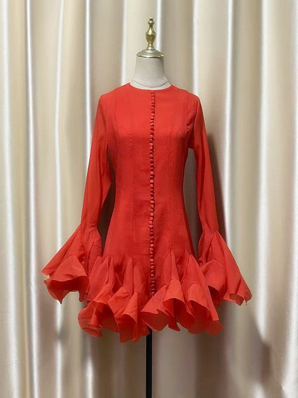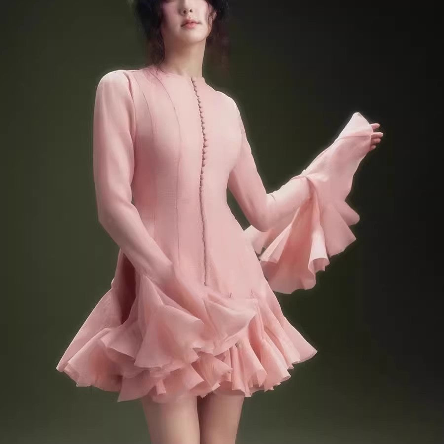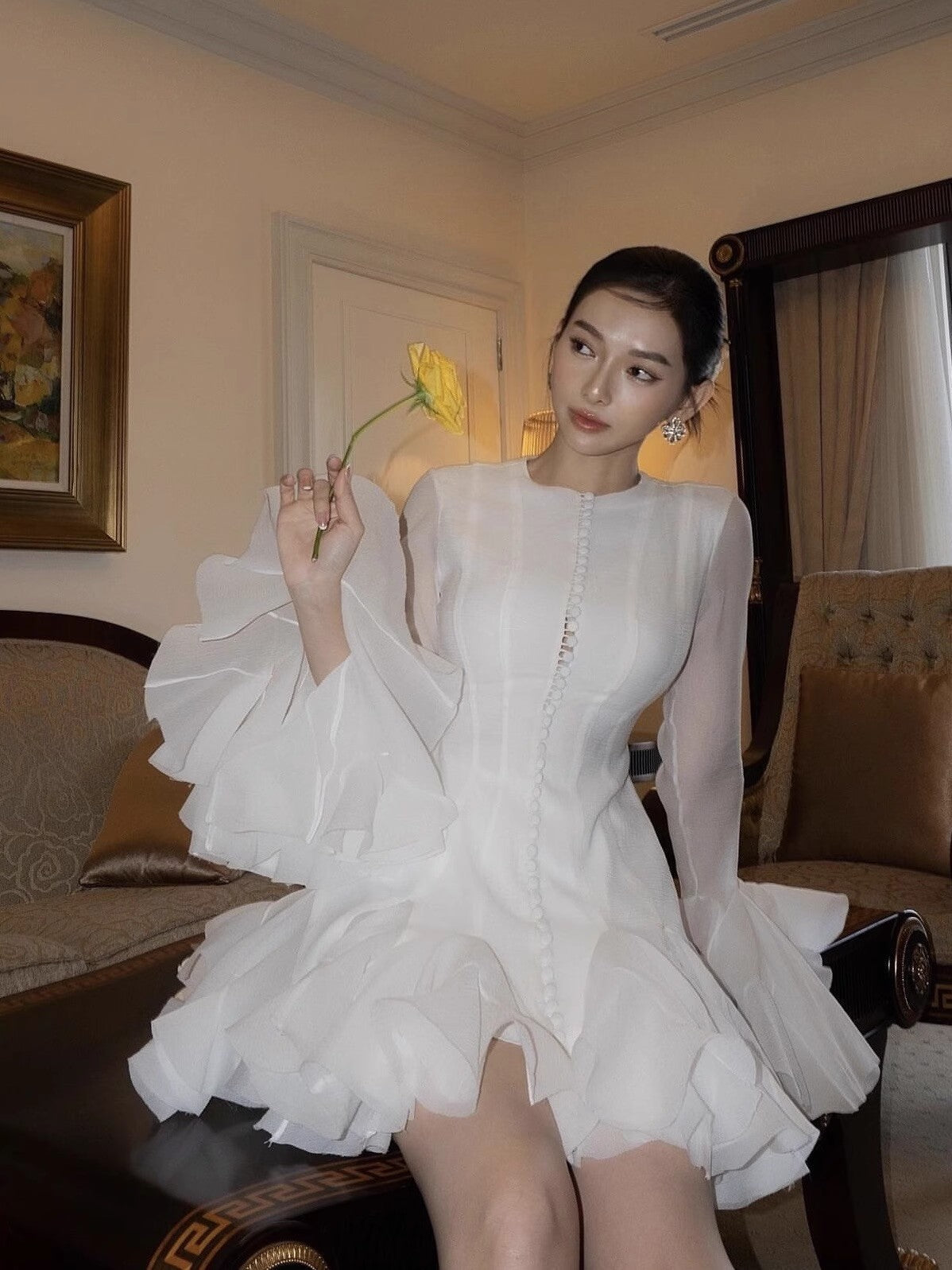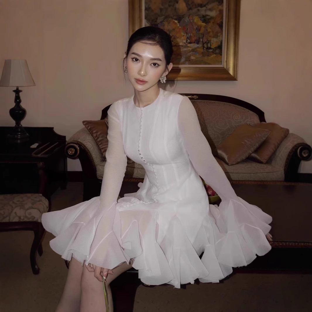 2025 Long-Sleeved Dating Dress Lotus Edge Cut Dress White Short Dress