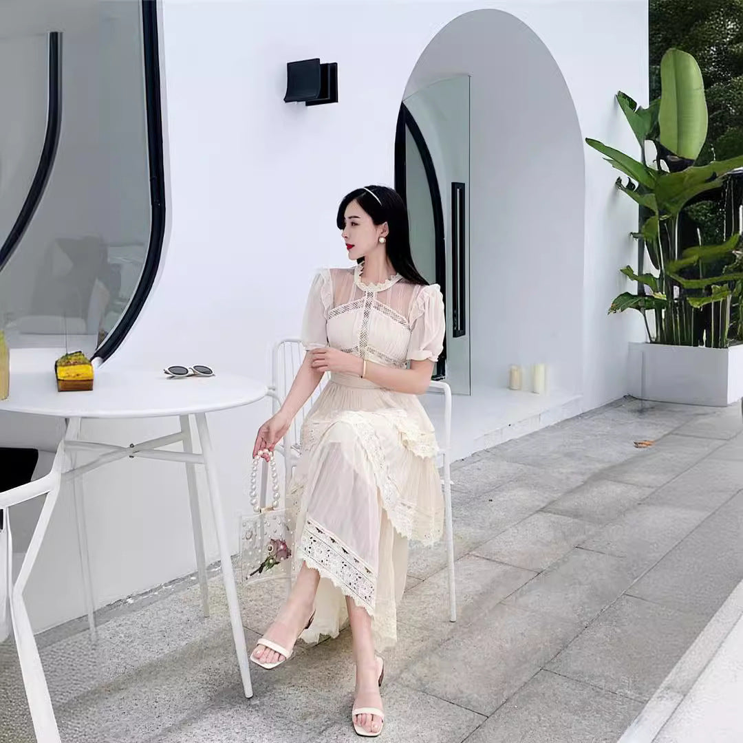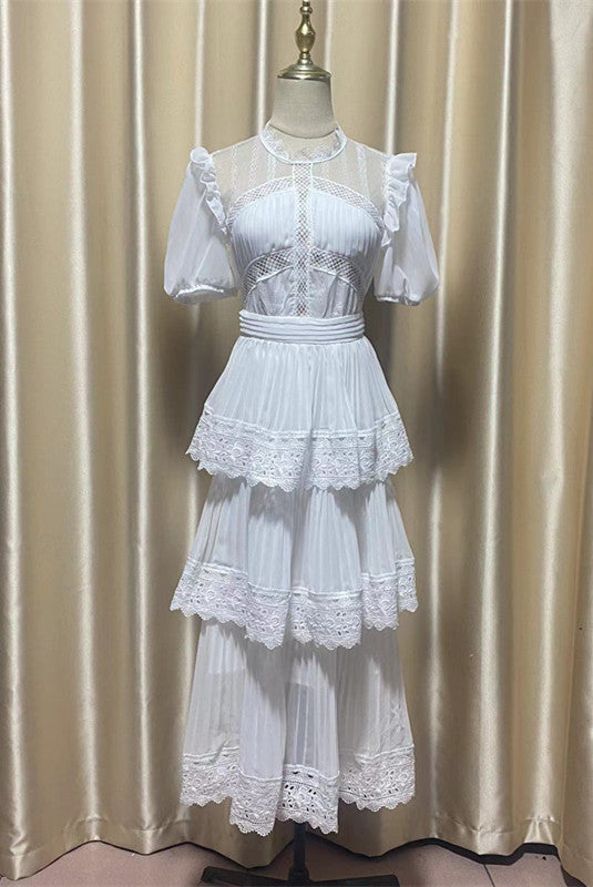 2025 Round Collar Folded Lace Yarn Cake Dress Dress