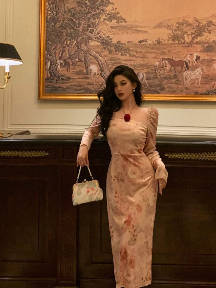A Line Square Neckline Long Sleeves Pink Floral Prom Dresses Birthday Outfits Evening Gown SD921