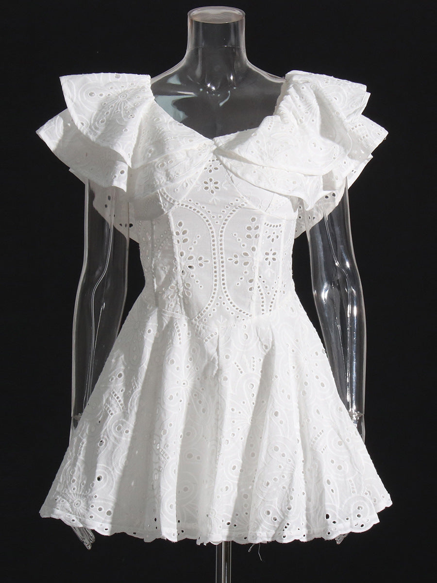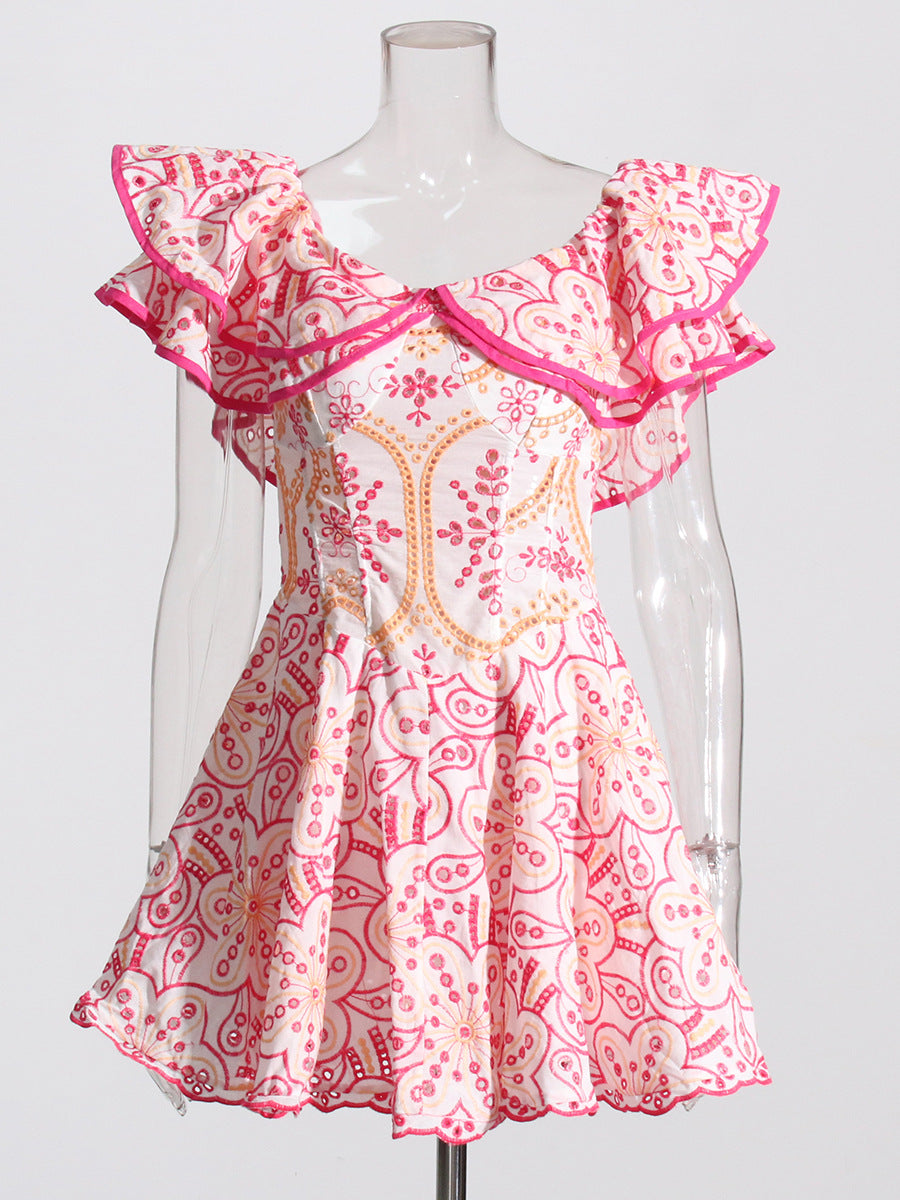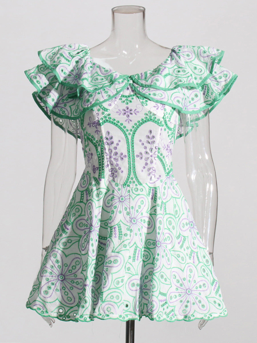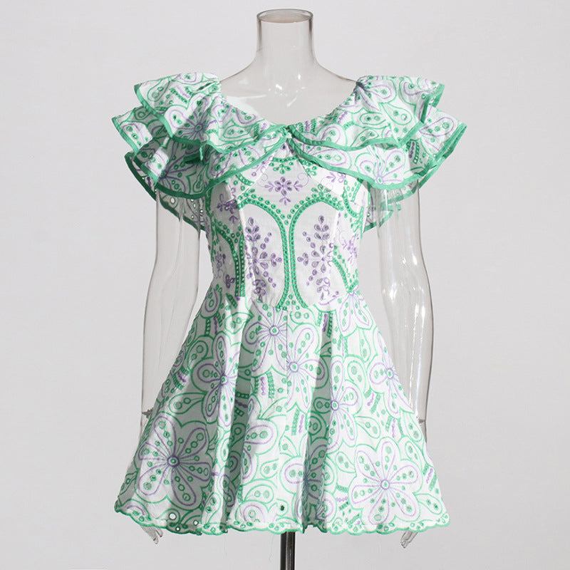 Bohemian Short Dress 2025 Spring New Word Collar Leaves Embroidered Hollow Dress Woman