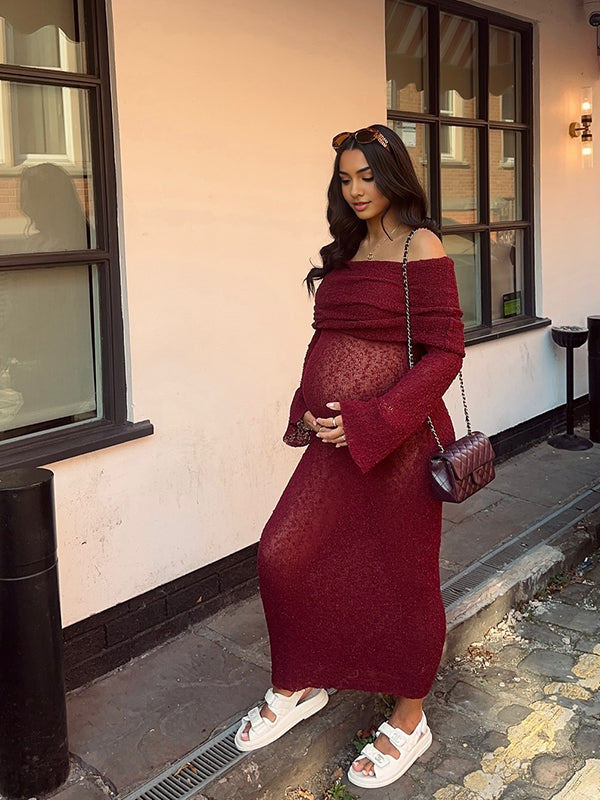 Burgundy Knitted Off Shoulder Flare Sleeve Bodycon Elegant Baby Moon Beach Cover Up Maternity Photoshoot Baby Shower Maxi Dress Maternity