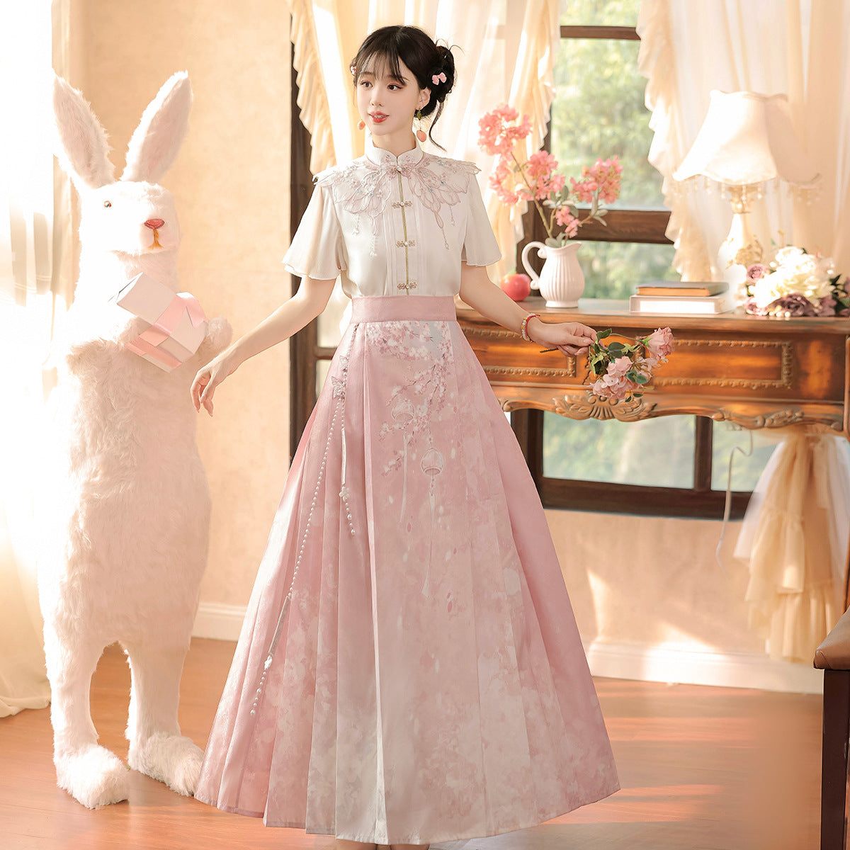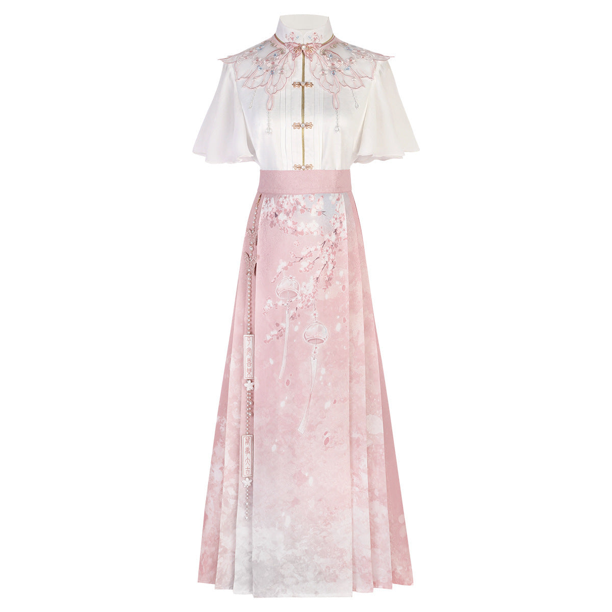 Design Fell Cherry Set Hanfu Women's Chinese Style Improvement Han Element Cloud Shoulder Shirt Half Skirt Set 9198